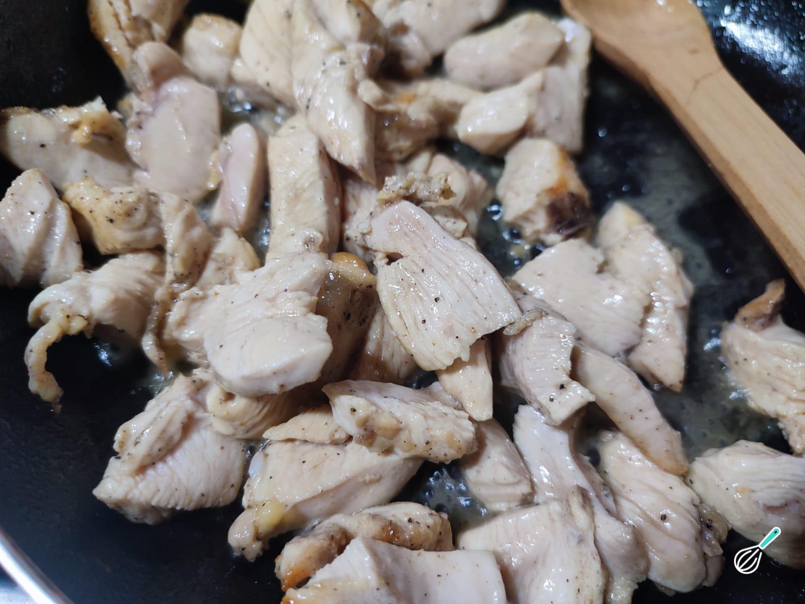 Aqueça um fio de azeite em uma frigideira grande e, quando estiver quente, adicione os pedaços de frango, que devem ser previamente temperados. Feche-os dos dois lados e reserve o frango.