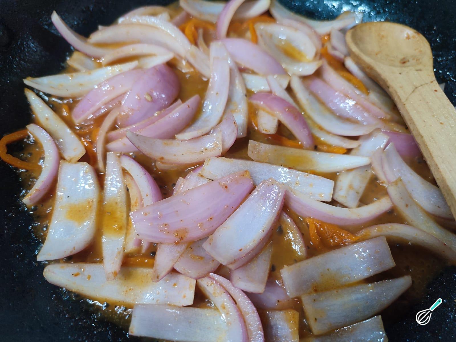 Quando você tiver cozinhado os ingredientes acima por alguns minuto,s em fogo alto, adicione o fio de vinagre vermelho aqui e continue cozinhando em fogo alto.