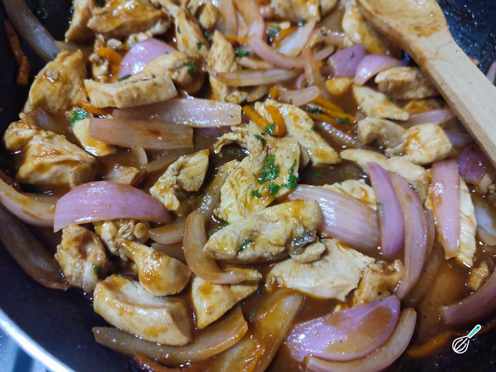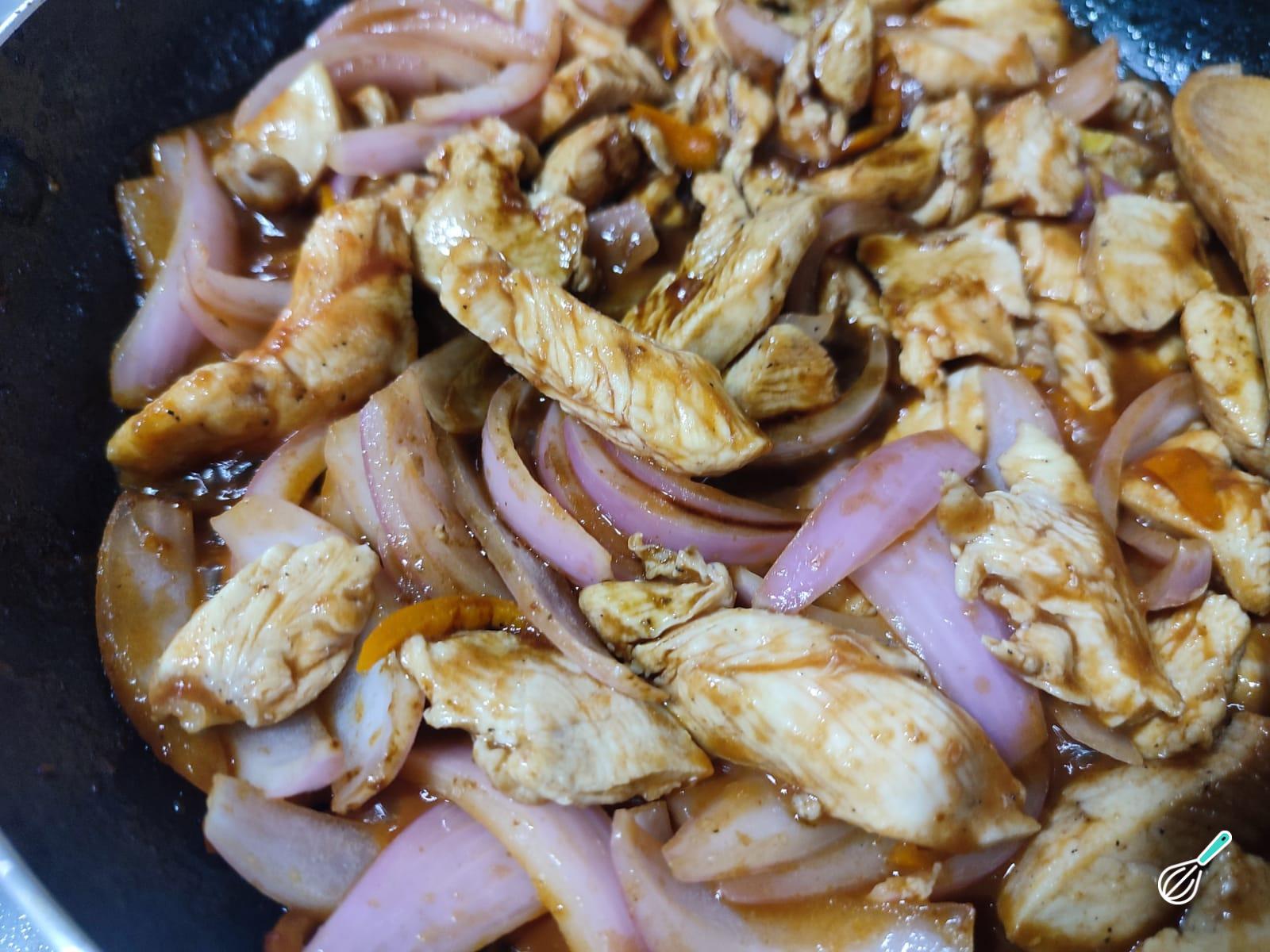 Retorne o frango ao preparo e acrescente o molho de soja, o molho de tomate e o caldo de galinha. Em seguida, adicione sal, pimenta e cominho a gosto, e cozinhe por cerca de 3 minutos.