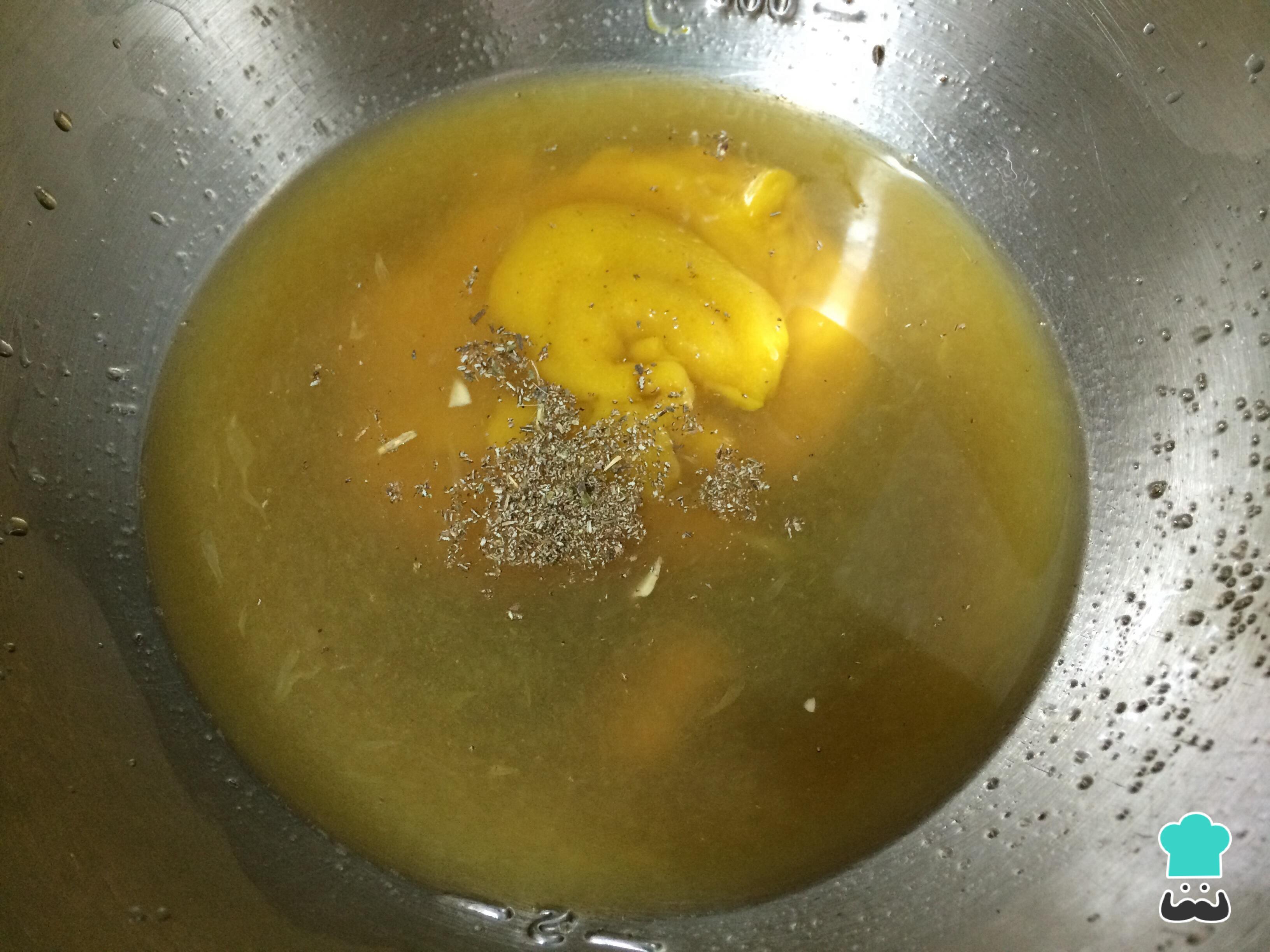 Em uma tigela coloque o suco das laranjas, o açúcar, o alecrim e a mostarda. Misture muito bem, até que o açúcar se dissolva e os restantes ingredientes se integrem.