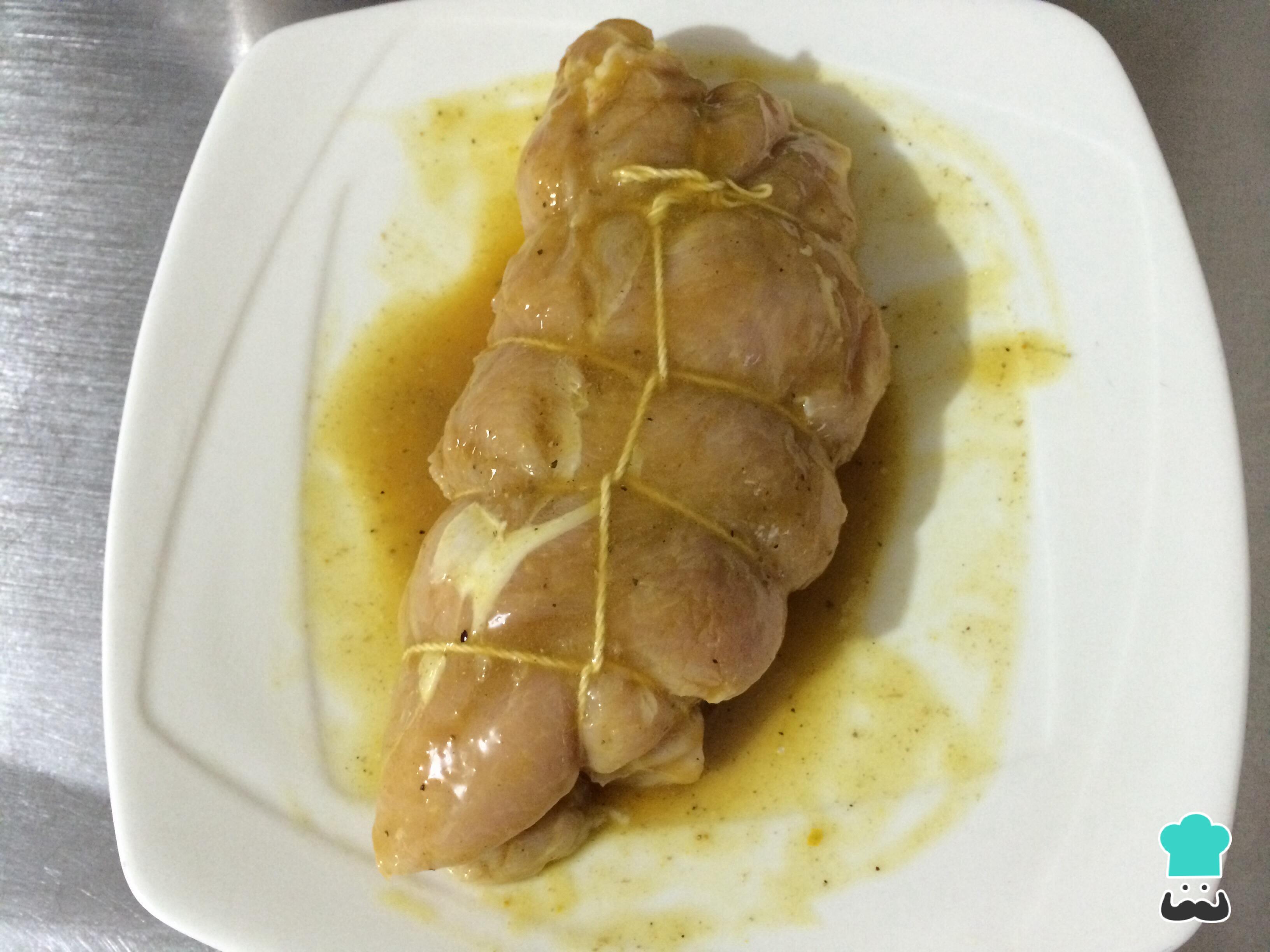 Feche o peito de peru, tempere por fora com sal e pimenta, e espalhe mais um pouco do molho. Amarre a carne com fio barbante, para que mantenha sua forma enquanto cozinha no forno. Reserve na geladeira por, no mínimo, 2 horas.