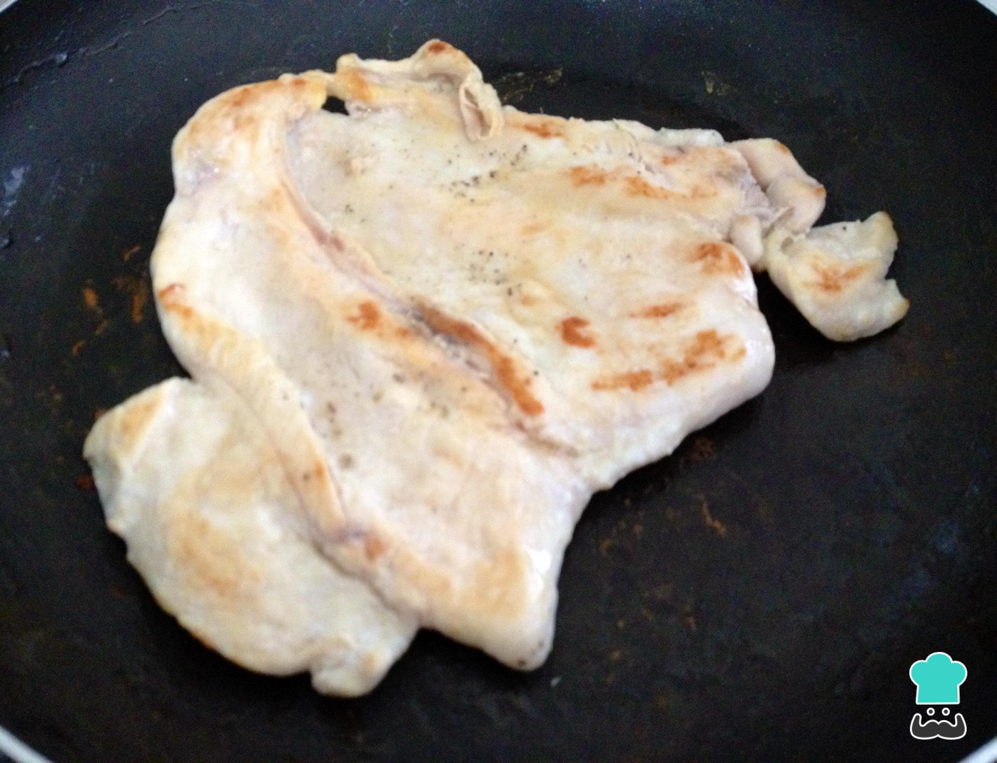 Em uma frigideira à parte coloque um pouco de óleo e leve ao fogo alto. Cozinhe os peitos de frango temperados com sal e pimenta durante 2 minutos de cada lado.