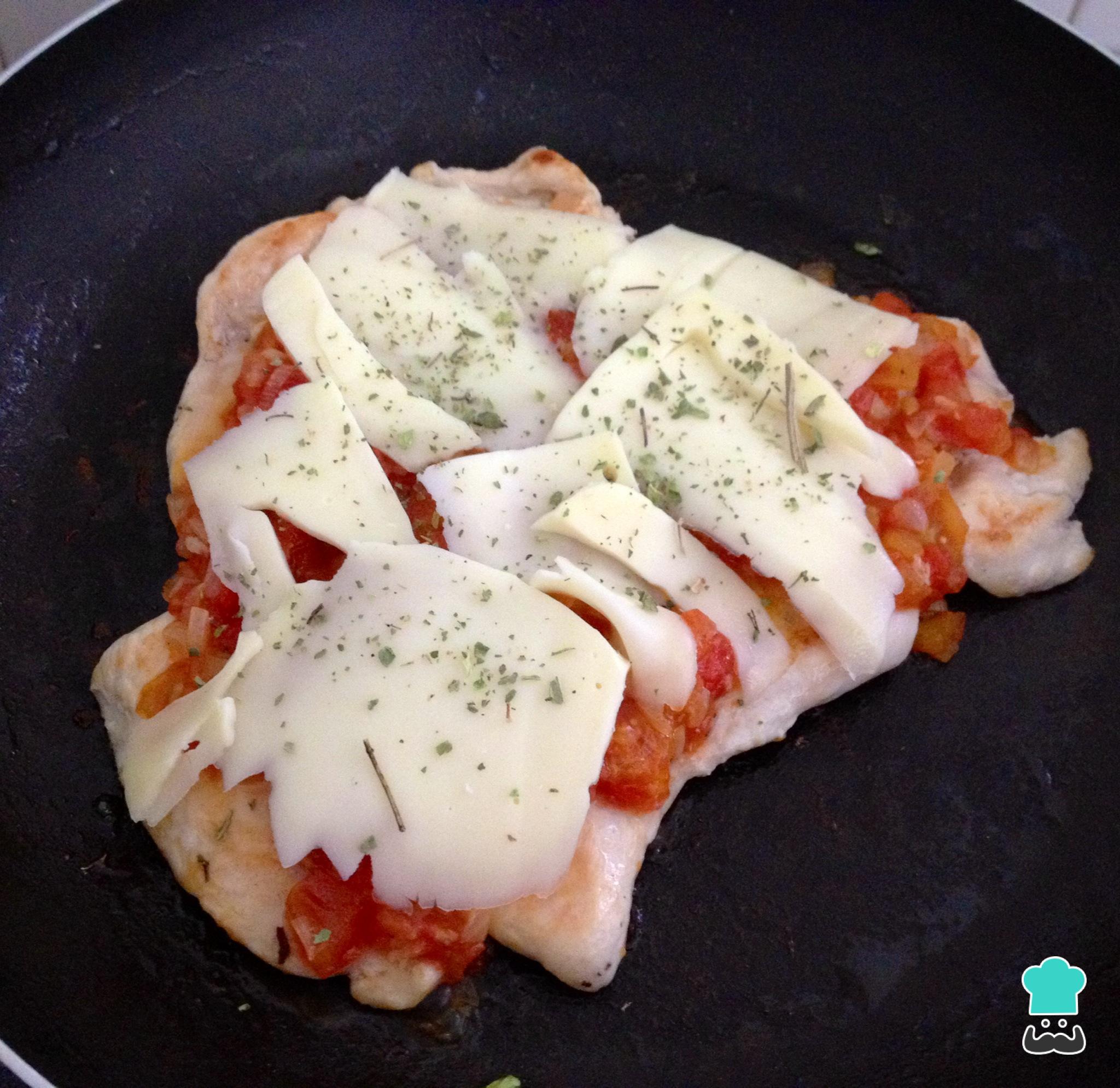 Cubra o peito com molho preparado antes e disponha sobre ele o queijo e oréganos. Tampe e cozinhe em fogo baixo até que o queijo derreta.