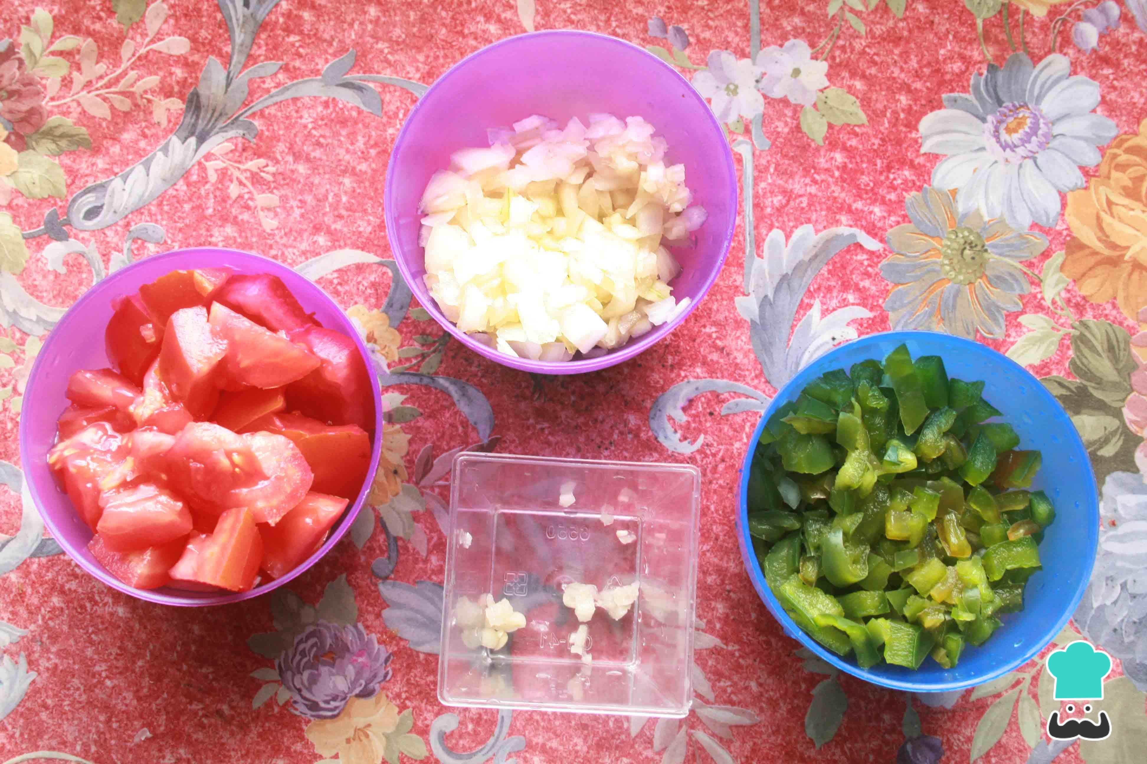 Prepare os legumes: corte os tomates em quartos, a cebola e o pimentão em cubinhos e amasse ou pique finamente os alhos.