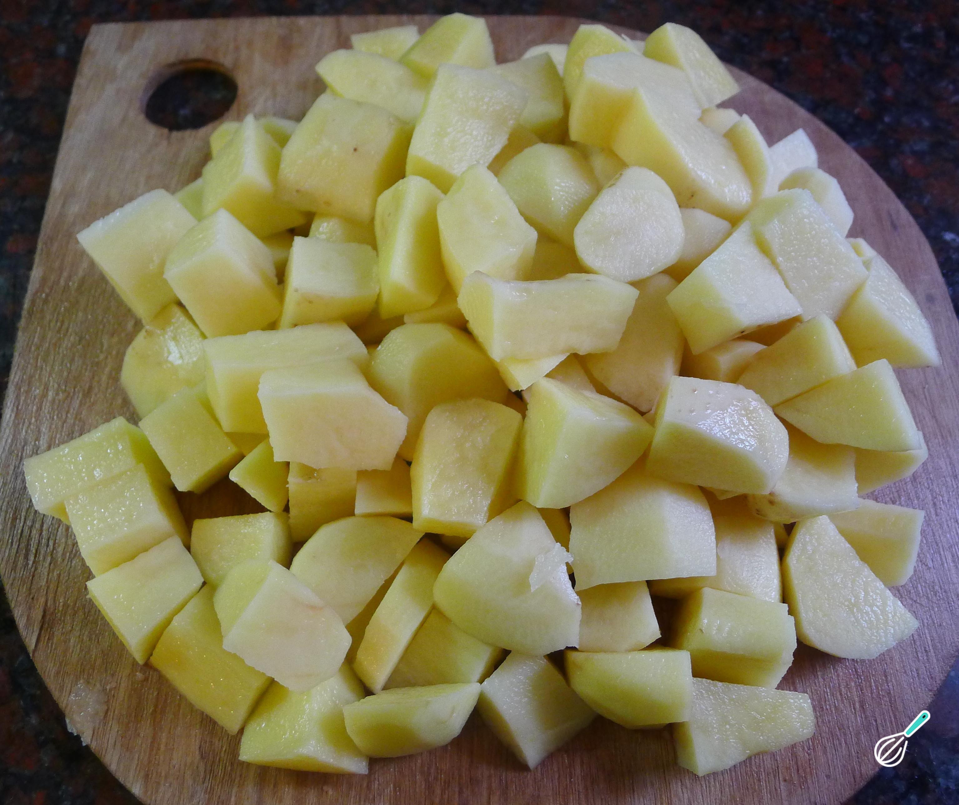 Lave, descasque e corte as batatas em cubos médios.