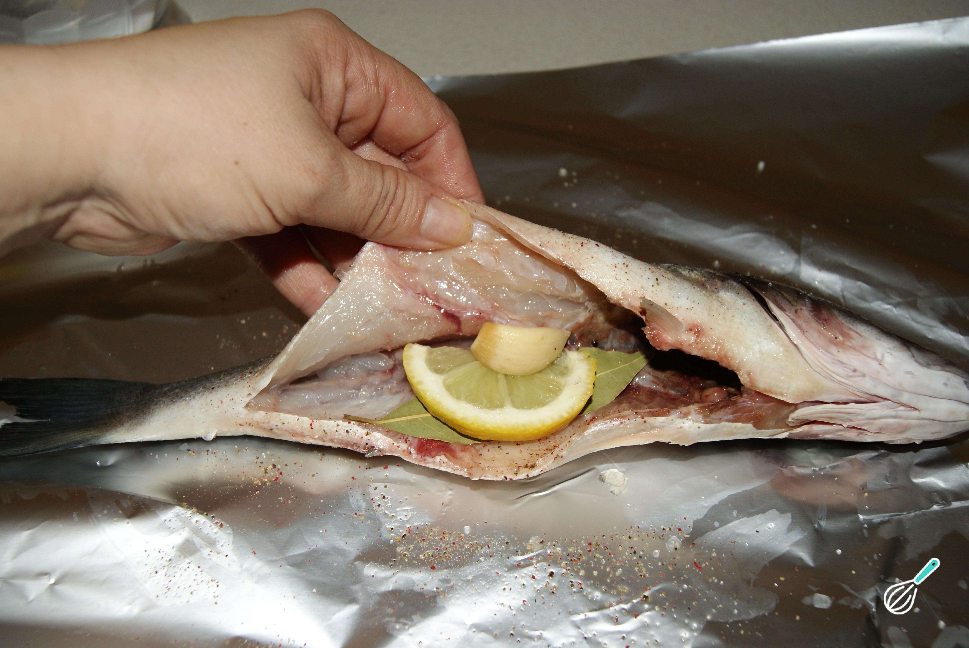 Em seguida tempere o peixe por dentro e por fora com sal e pimenta a gosto. No interior coloque uma folha de louro, uma rodela de limão e um dente de alho descascado.