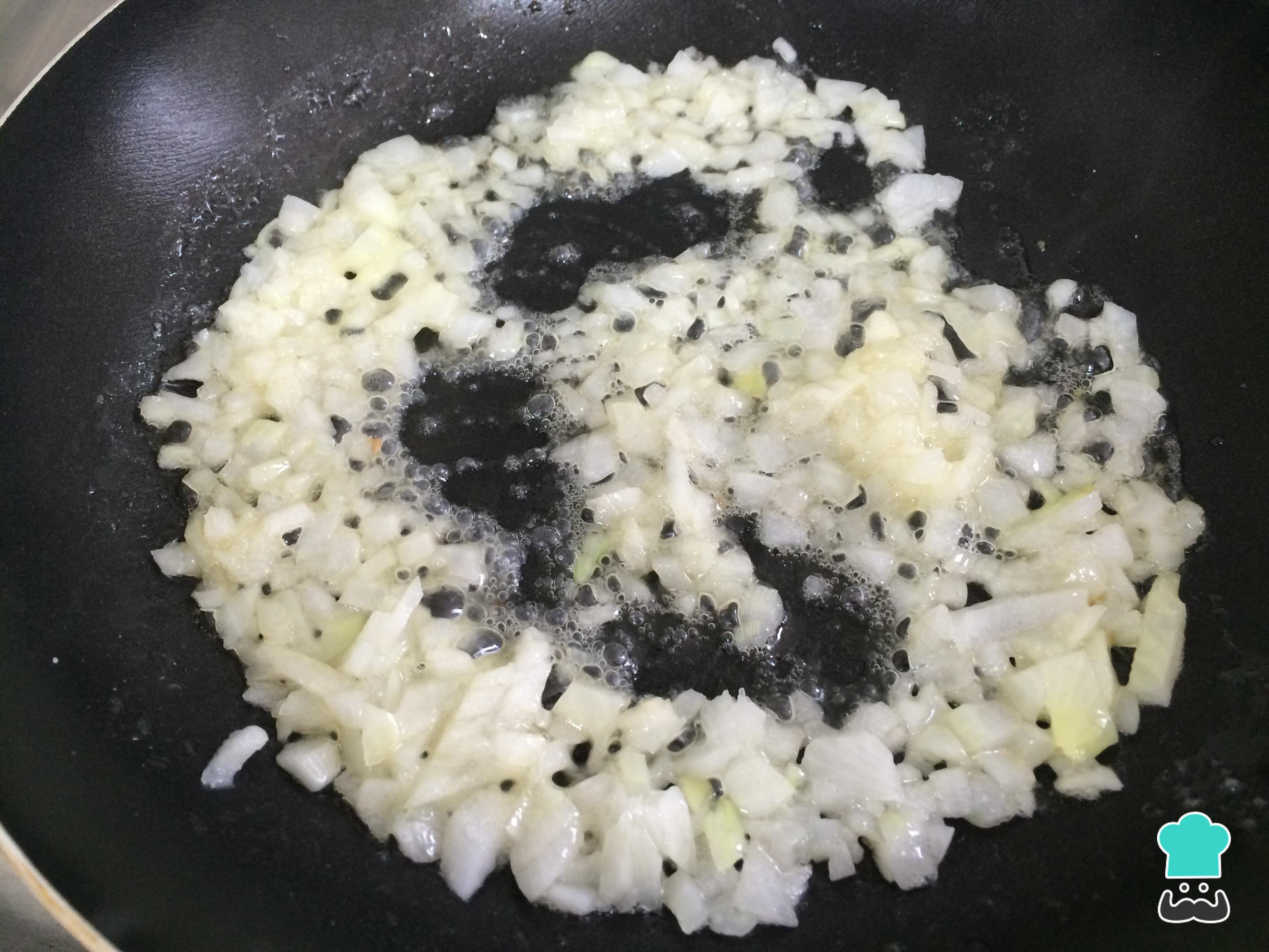 Para fazer esta receita de peixe, comece por preparar o molho: refogue a cebola picada na manteiga, até ficar transparente.