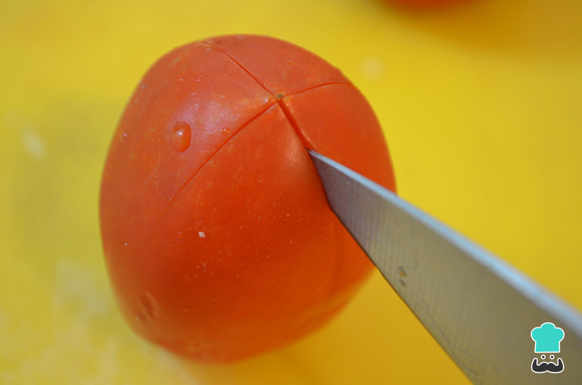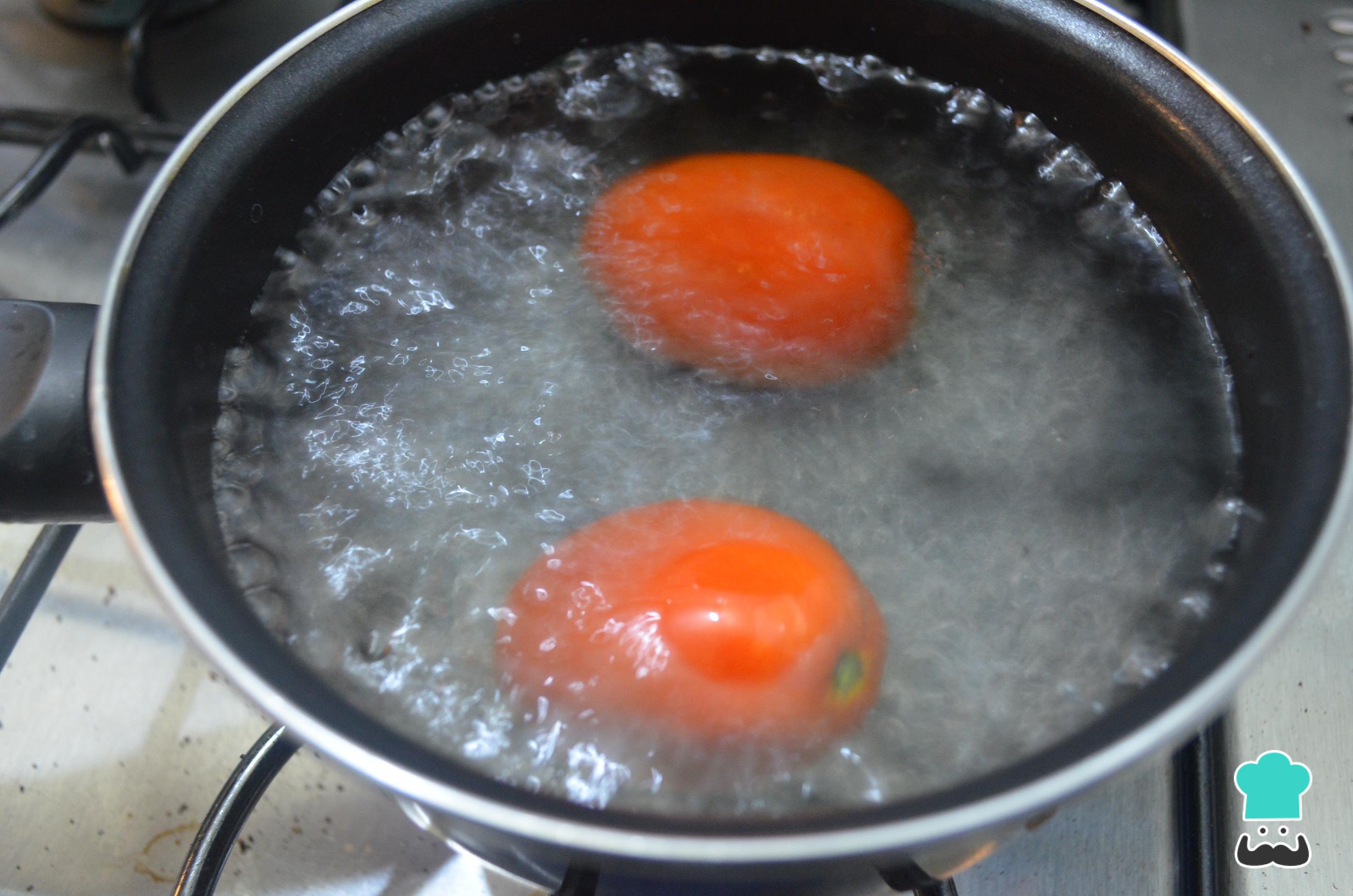 Coloque os tomates em água fervente durante 1 minuto. Retire e coloque em água fria. Este é um dos truques para pelar tomate facilmente.