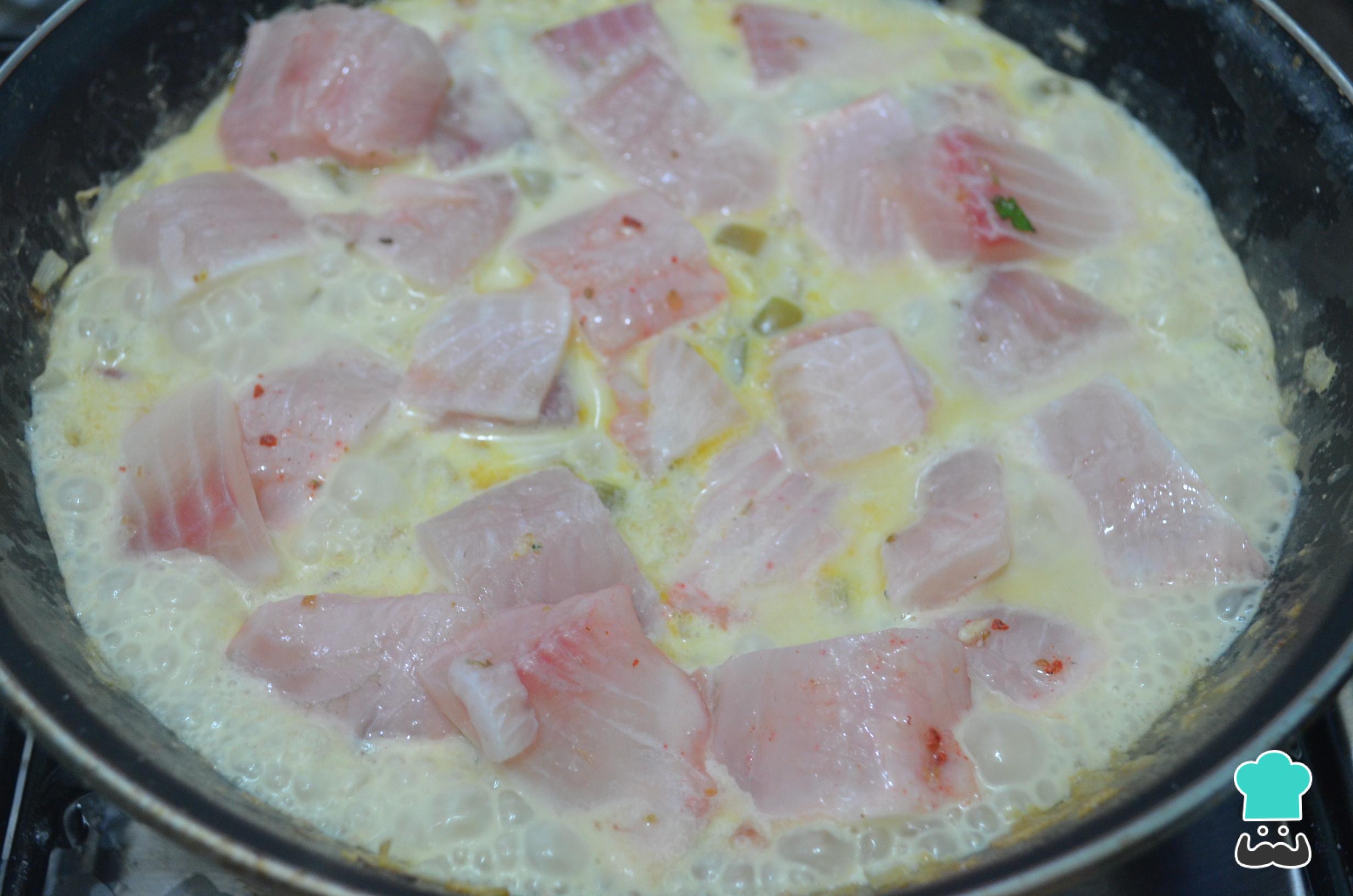 Finalmente junte o peixe ao molho de coco e cozinhe por 20-25 minutos, ou até observar que já não está cru. Acerte o sabor com sal a gosto.