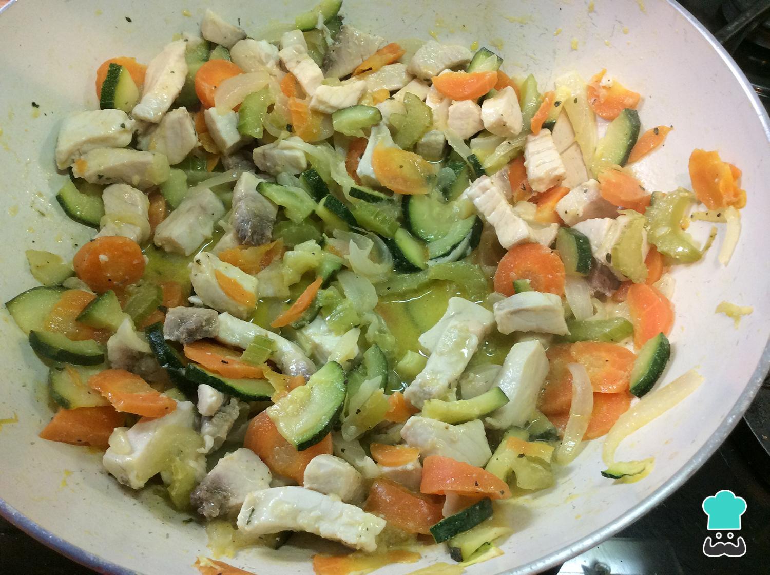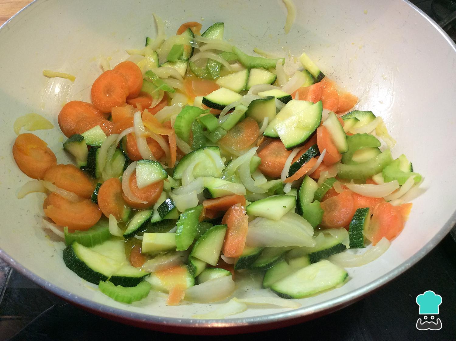 Para começar a preparar este salteado de peixe e legumes, primeiro lave e corte a abobrinha, a cenoura e o aipo em pedaços, e a cebola em tiras. Coloque todos os ingredientes numa frigideira com um pouco de azeite, leve ao fogo médio-alto e salteie por 5 minutos.