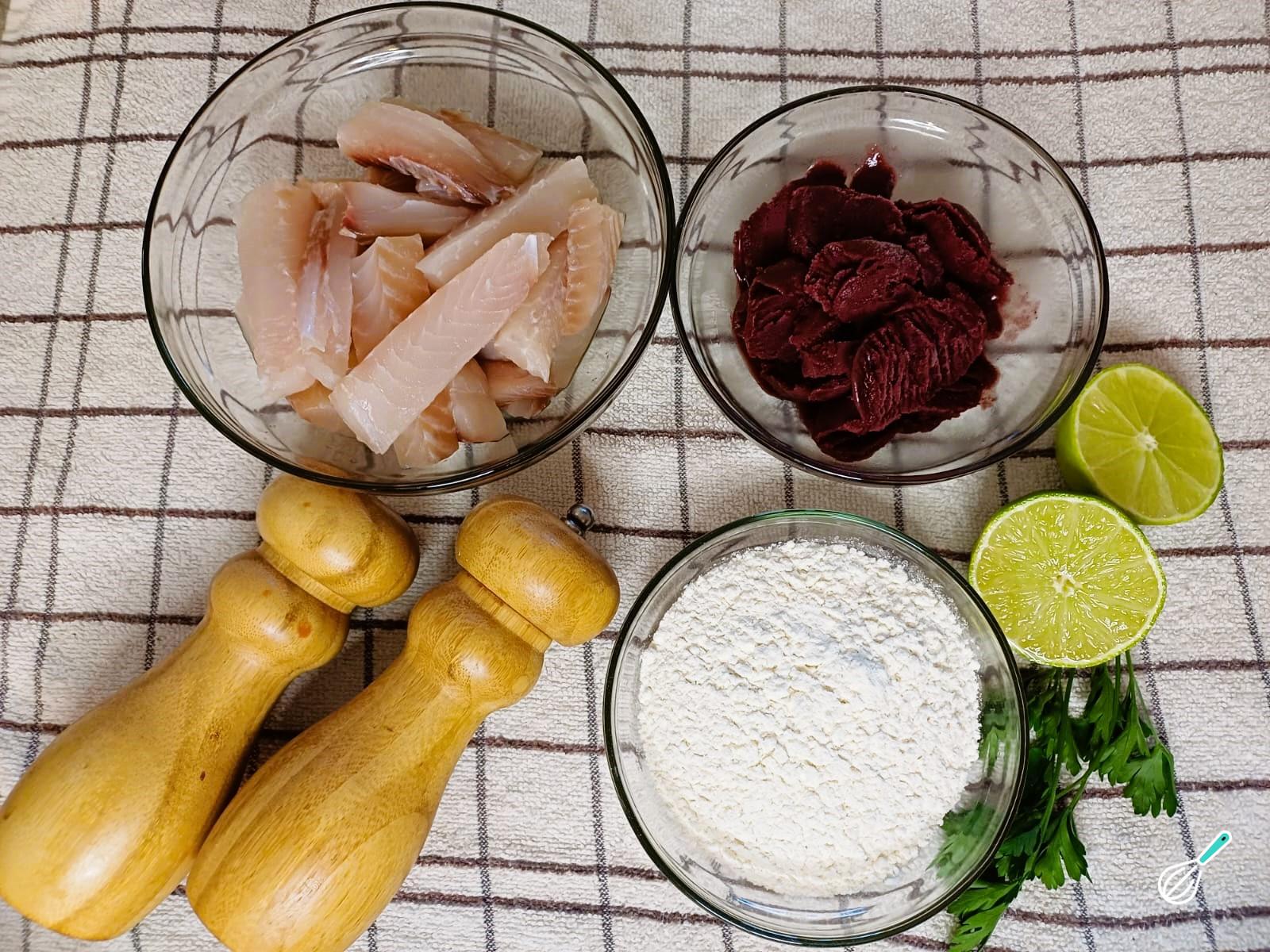 Reúna todos os ingredientes necessários para o preparo desta receita de peixe frito com açaí.