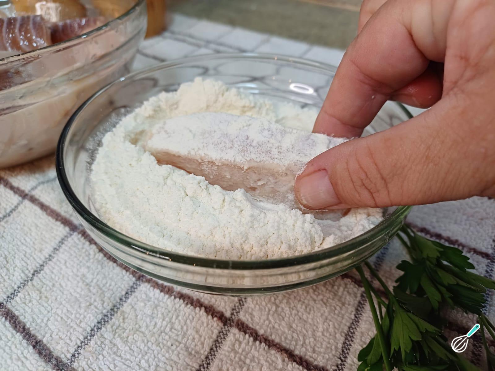 Passe agora as iscas na farinha de trigo, cobrindo-as completamente.