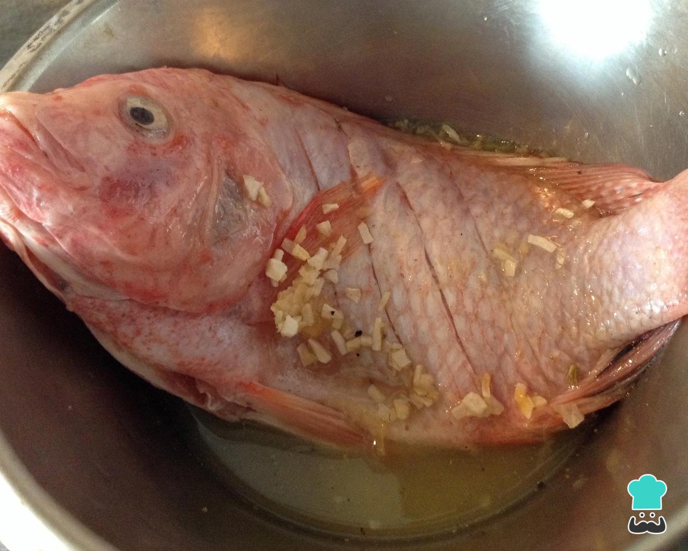 Pegue o peixe e limpe-o bem, retirando as vísceras e escamas. Enxague bem e faça alguns cortes ao longo do peixe, como na fotografia, para que os temperos peguem melhor e para facilitar a fritura.