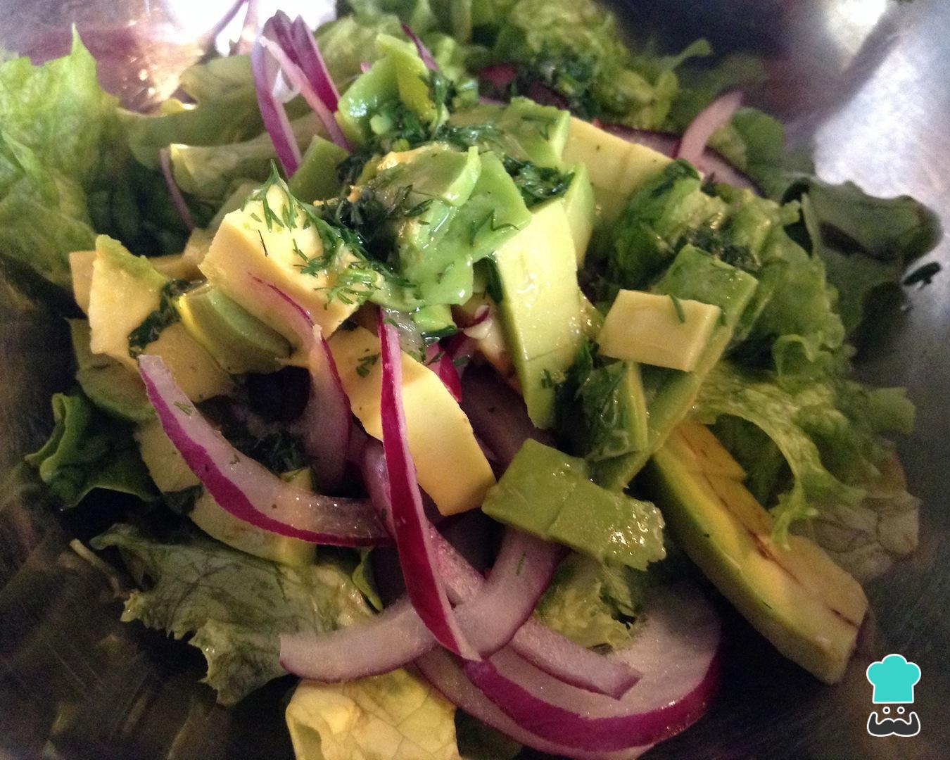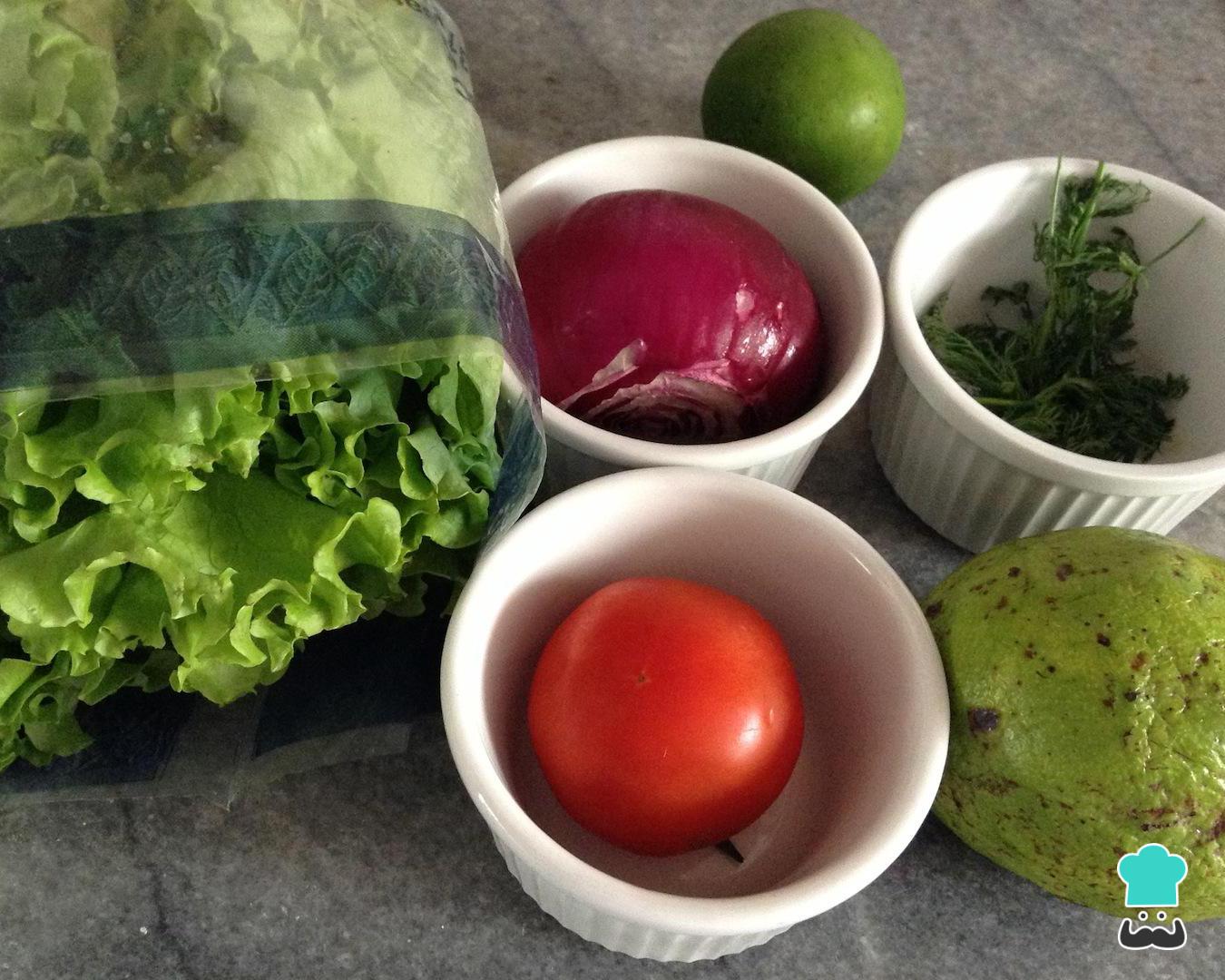 Enquanto isso, comece preparando a salada que acompanha o peixe frito. Neste caso, minha receita de peixe frito é de inspiração colombiana, por isso preparei uma salada colombiana com alface, tomate, cebola roxa, abacate, cheiro verde, limão e sal.