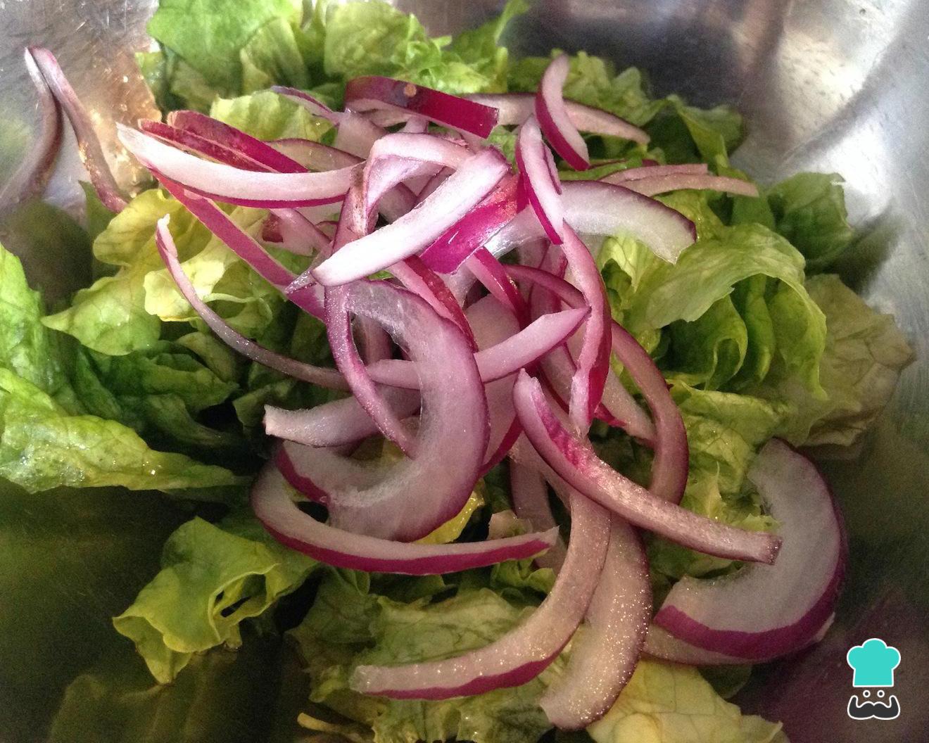 Lave e higienize as folhas de alface com um pouco de vinagre, enxague e corte em pedaços. Corte a cebola em meias luas e adicione num bowl junto com a alface.