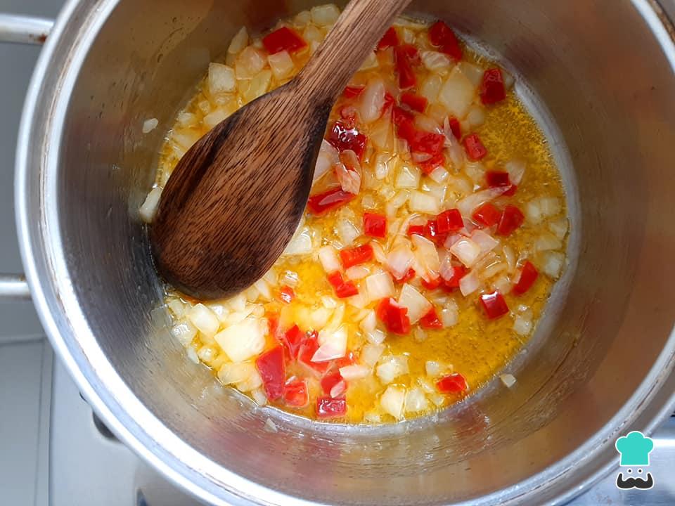 Enquanto o peixe pega o sabor dos temperos, prepare a farofa para rechear peixe e servir de acompanhamento. Aqueça a manteiga numa panela média e acrescente a cebola, refogando por alguns minutos. Adicione o pimentão vermelho picado e refogue mais um pouco.