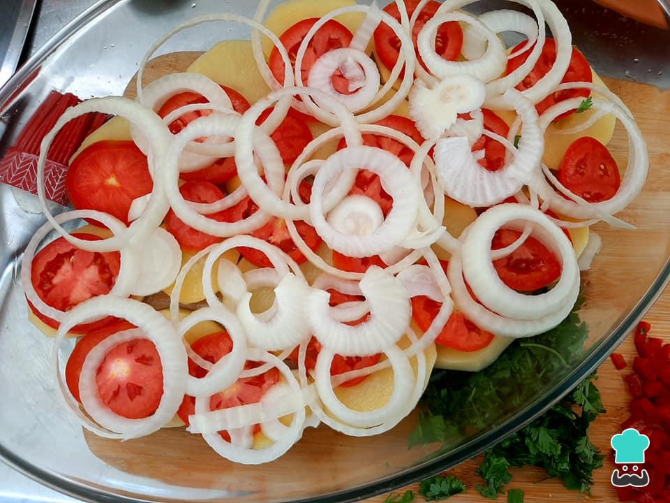 Num refratário grande (que caiba o peixe inteiro), untado com azeite de oliva, coloque camadas de rodelas de batata, de tomate e de cebola. Tempere com sal e pimenta do reino.