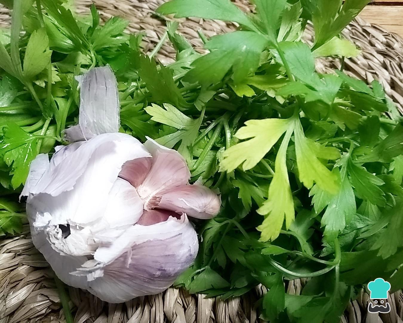 Enquanto isso pique os dentes de alho e a salsinha, coloque num recipiente (de preferência um almofariz) e adicione 1 copo pequeno de azeite de oliva e o vinagre de maçã ou suco de limão. Misture muito bem, amassando o alho e a salsinha, para criar liga e conseguir uma receita de peixe meca ao molho deliciosa!