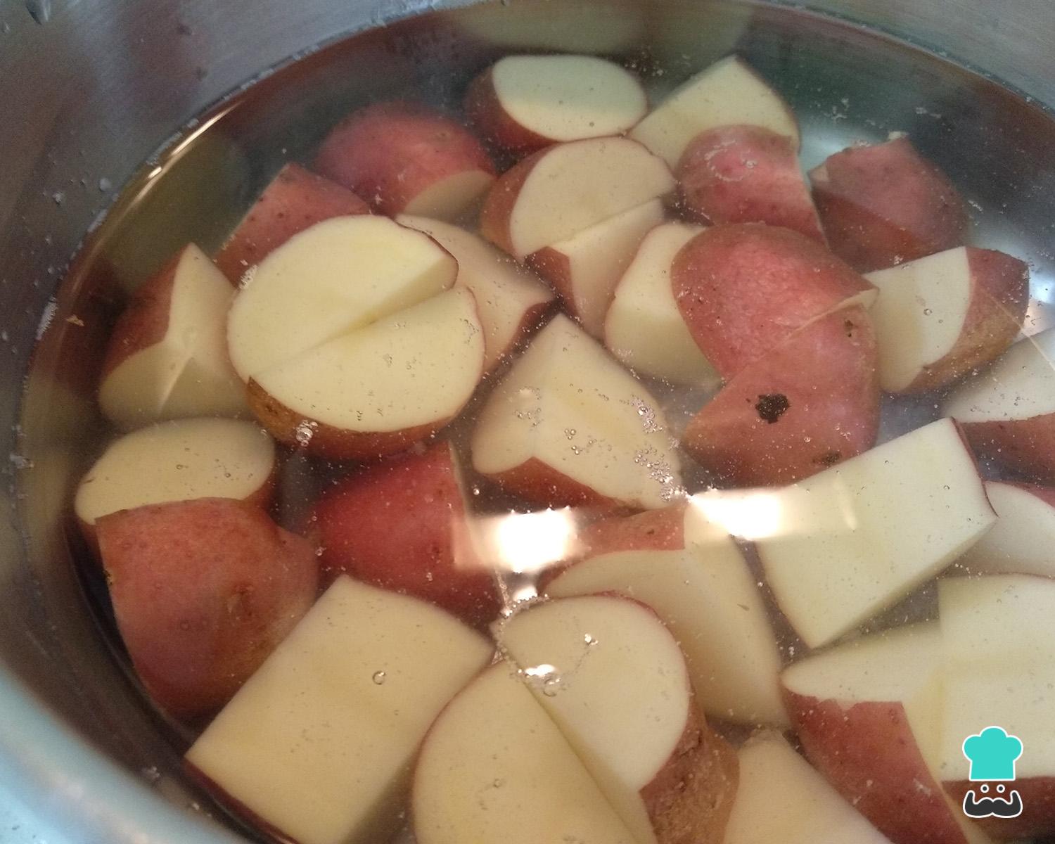 Comece por lavar bem as batatas (elas serão cozinhadas com a pele), cortar em pedaços menores e colocar numa panela no fogo médio. Cubra com água, acrescente um pouco de sal, tampe e cozinhe até ferver.