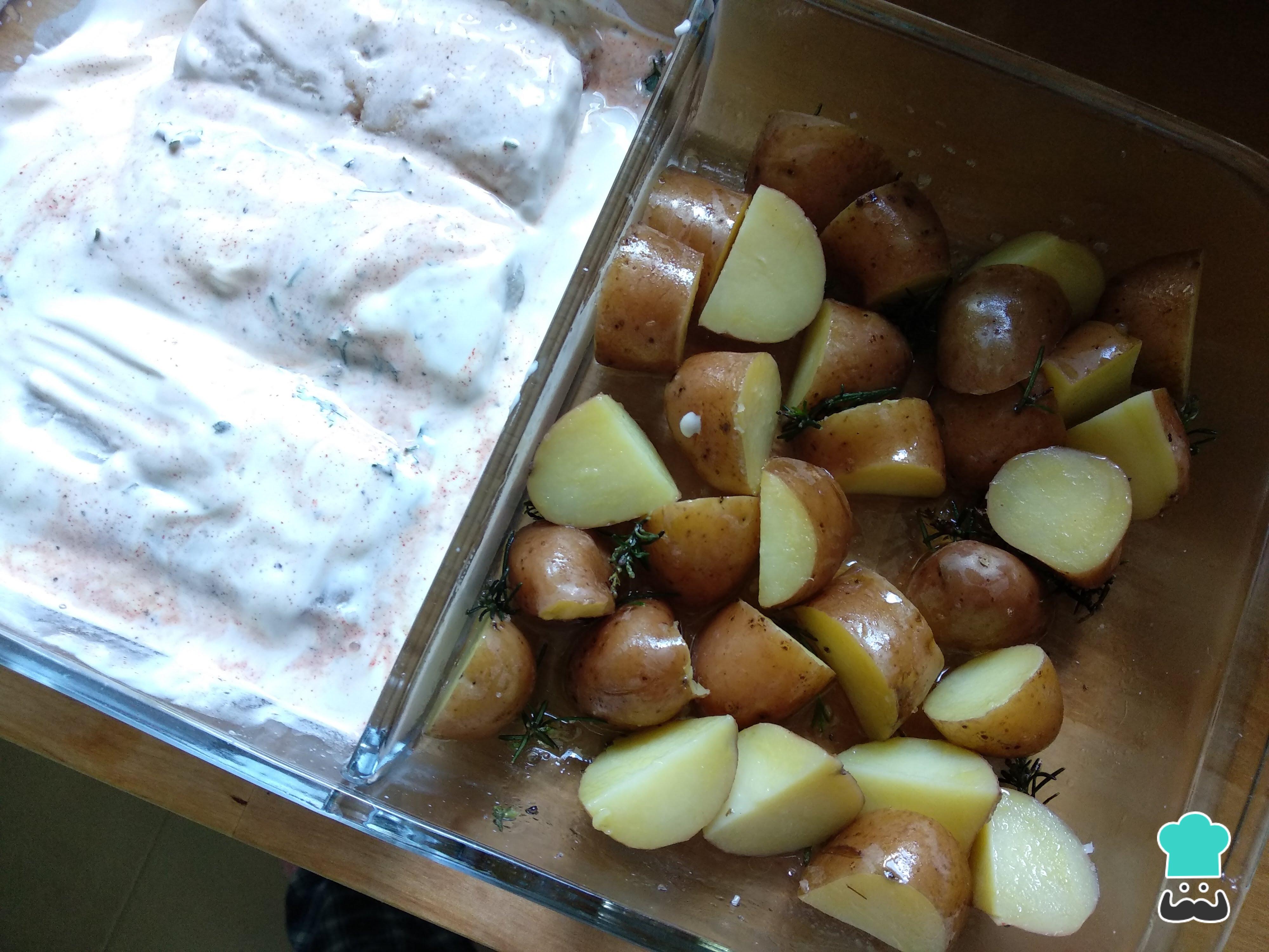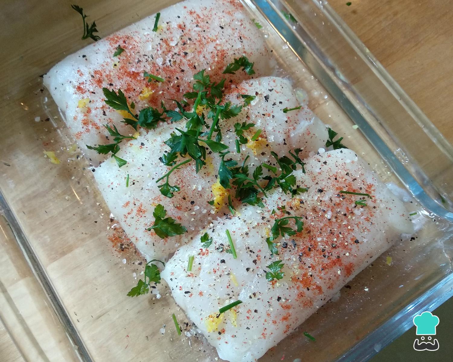 Enquanto as batatas pré-cozinham, coloque o peixe na assadeira e tempere com o suco e raspas de limão, a páprica, sal, pimenta e salsinha a gosto. Deixe ficar para tomar o sabor.