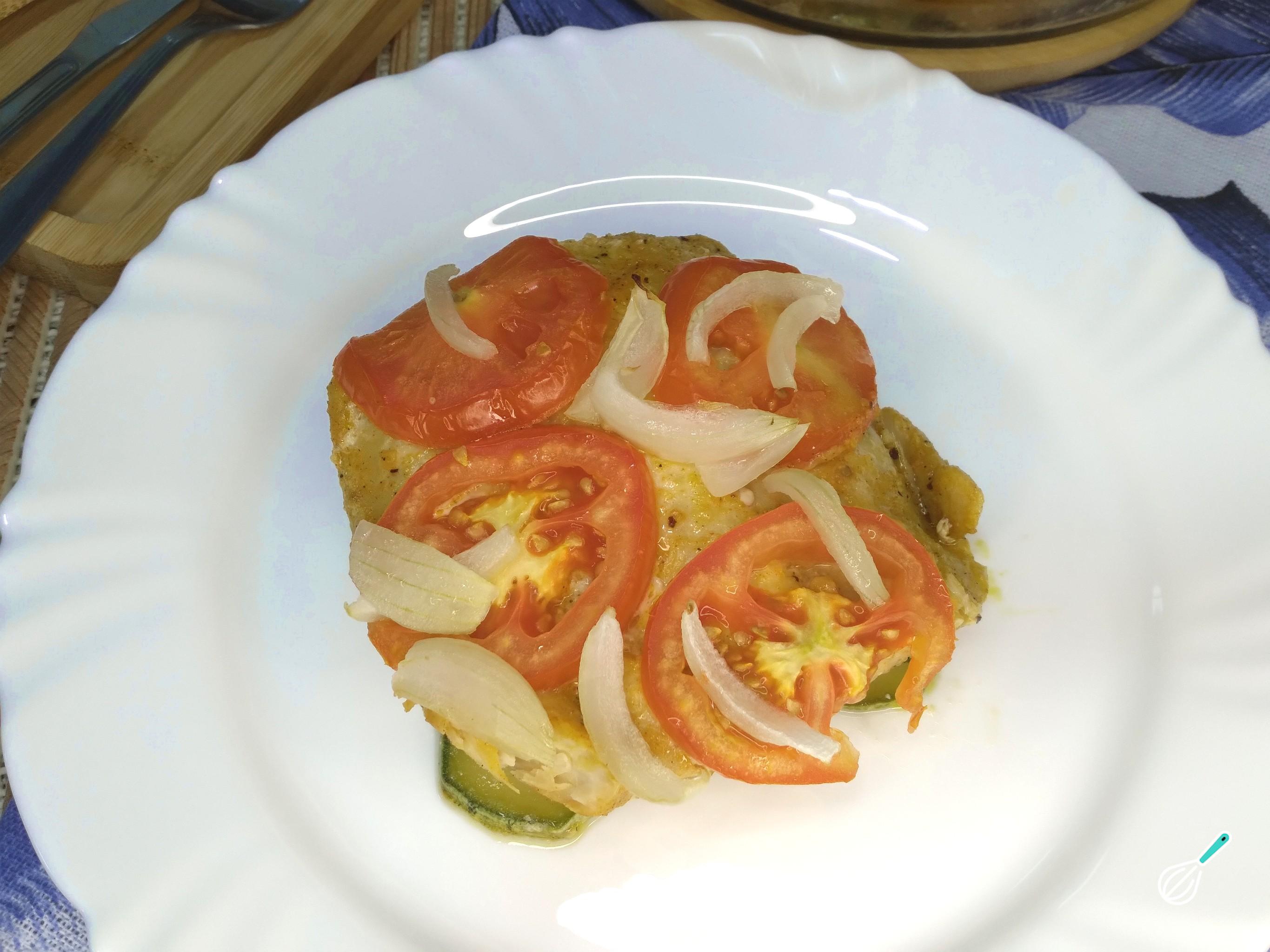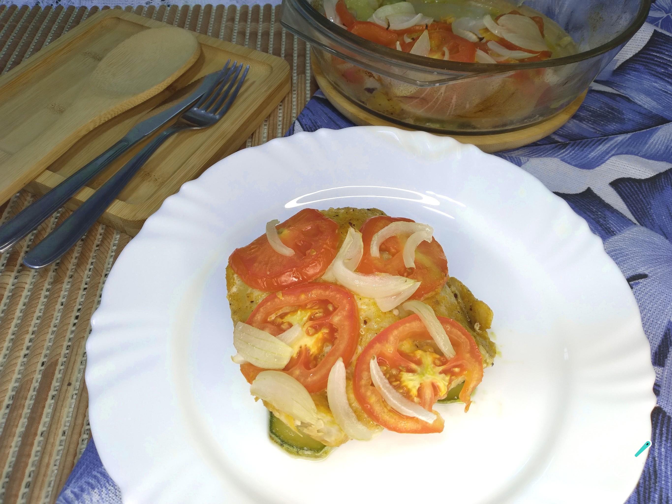 Para essa receita, usaremos batatas, abobrinha verde, tomates e cebola. O resultado é um peixe úmido, suculento e muito bem temperado.