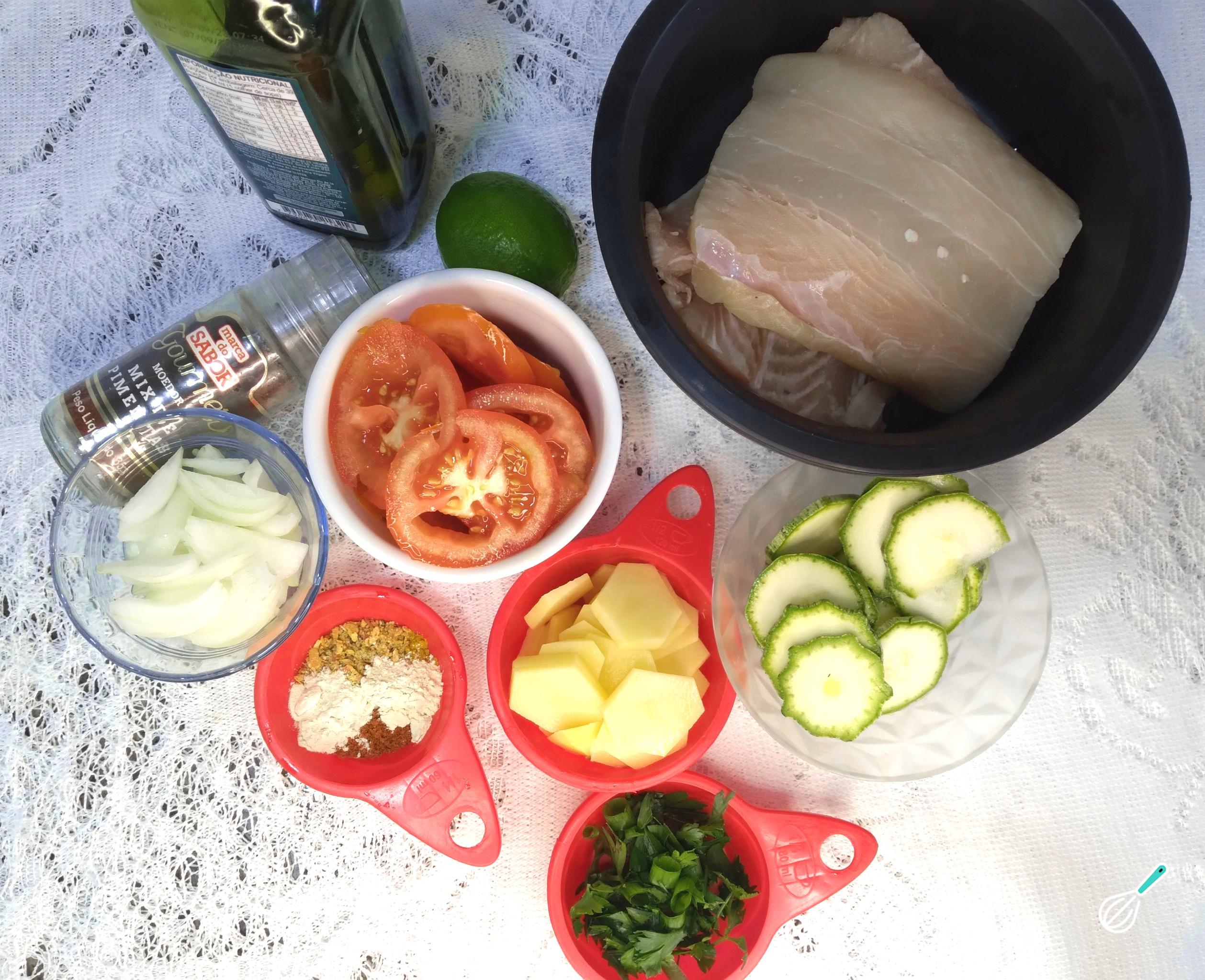 Comece separando os ingredientes. Separe as postas de peixe, corte a cebola branca em formato de meia lua. Corte as batatas e a abobrinha em rodelas bem fininhas. Os tomates corte em rodelas não muito finas. Separe os temperos de sua preferência.