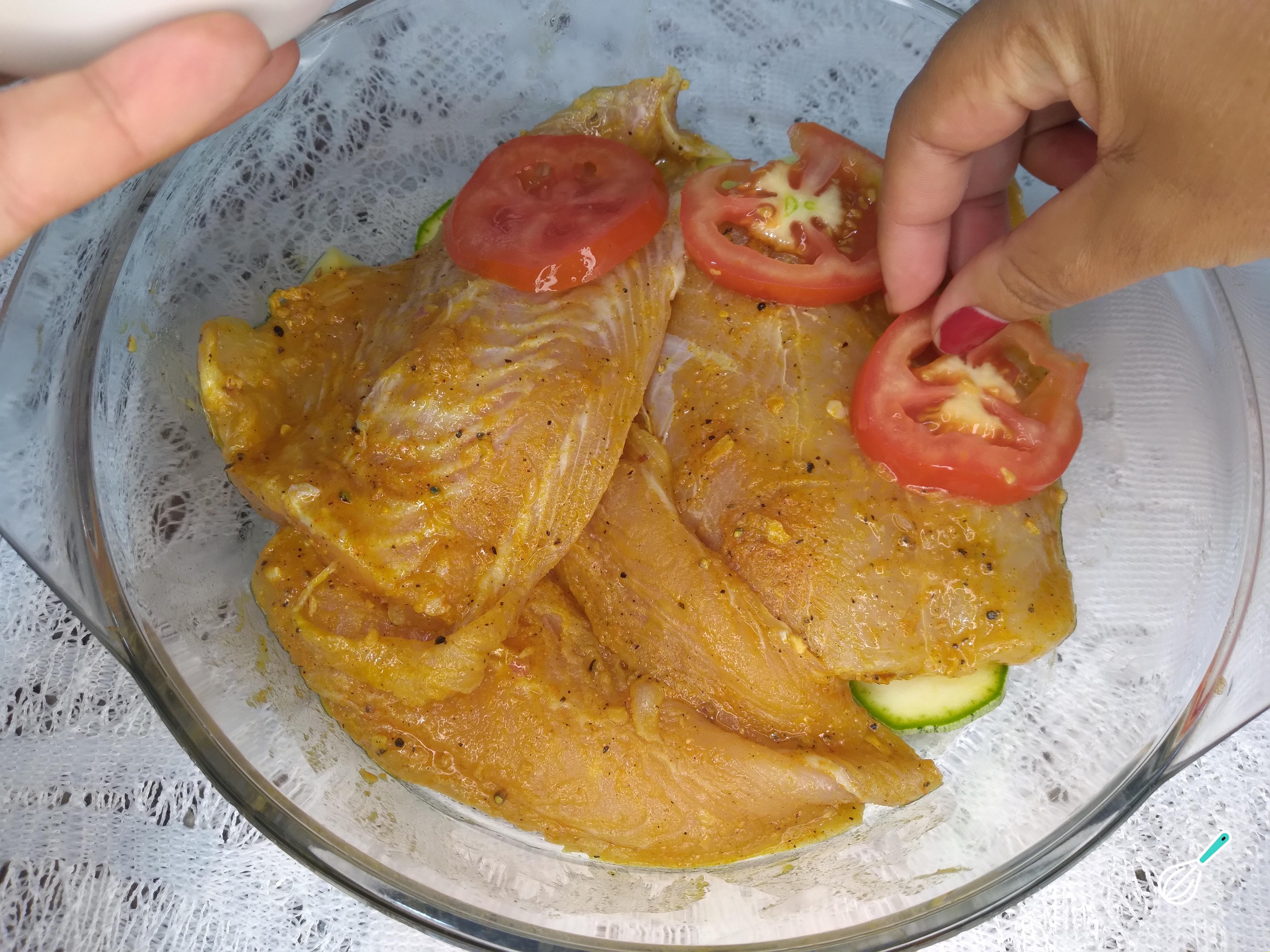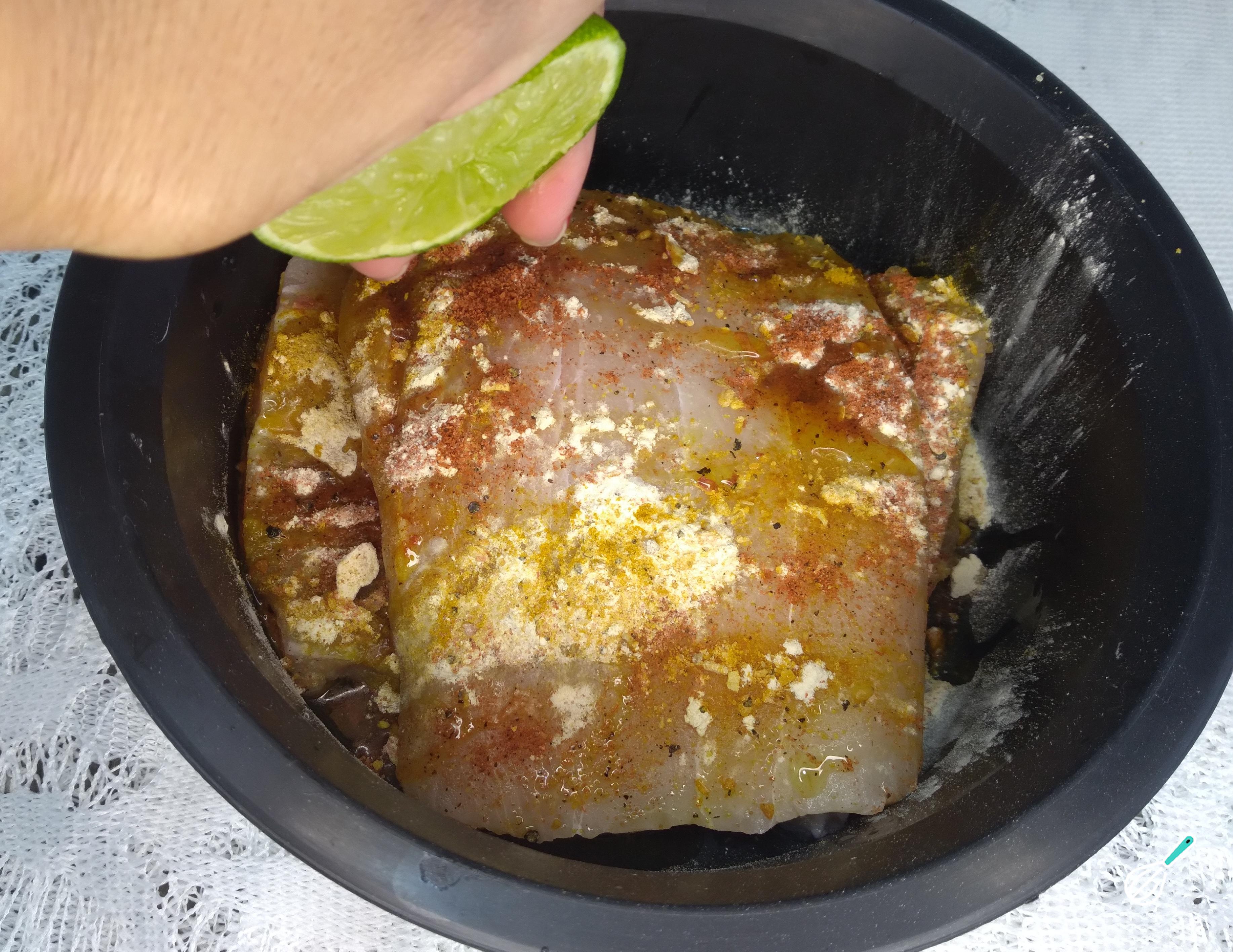 Feito isso, em um pote tempere o peixe. Coloque os temperos de sua preferência, o sal, pimenta, um fio de azeite e o suco de 1 limão. Misture bem e deixe na geladeira por cerca de 10 minutos.