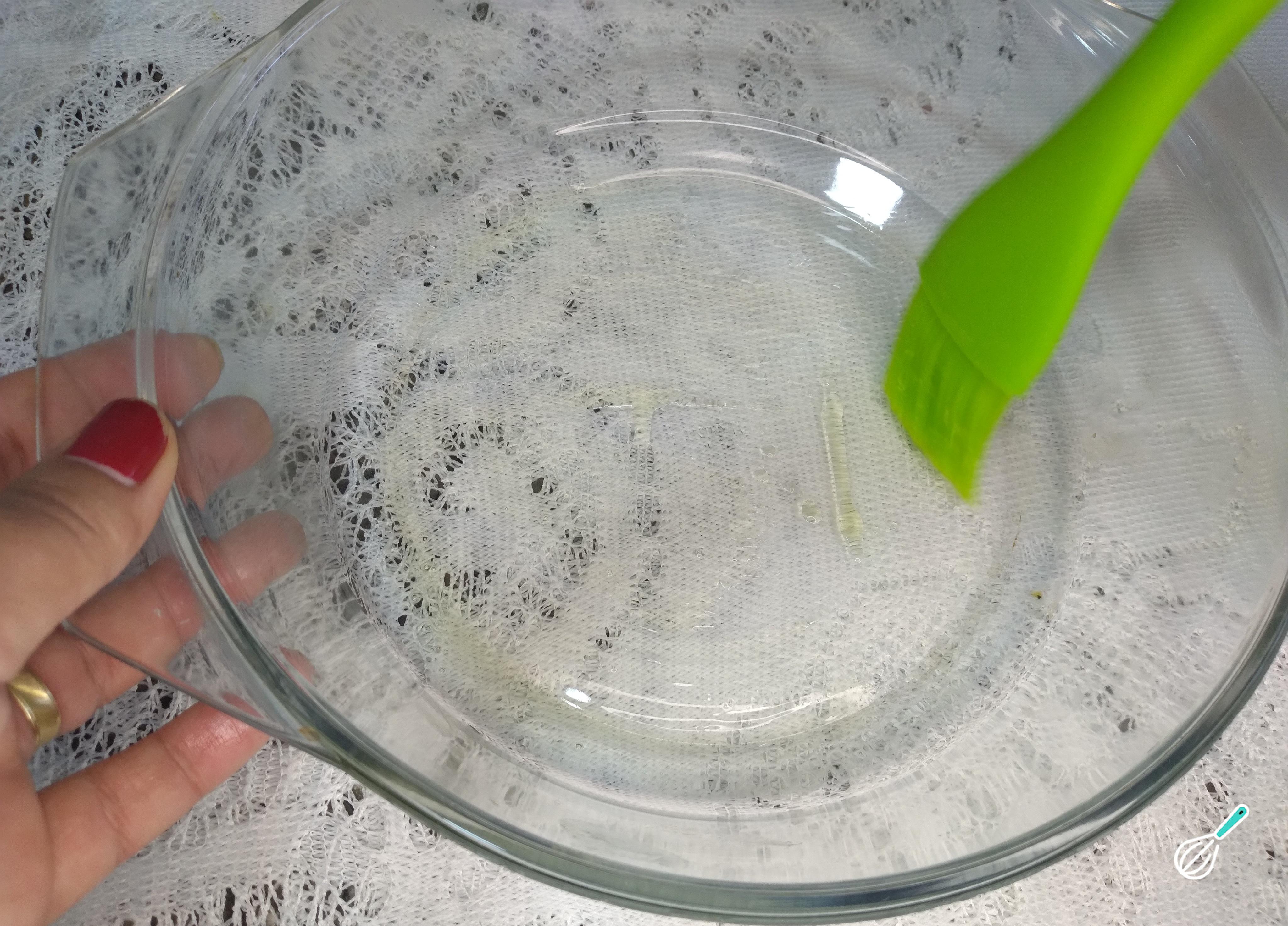 No refratário, coloque um fio de azeite e com o auxílio de um pincel culinário espalhe sobre toda a superfície. Deixe o refratário umedecido por igual.