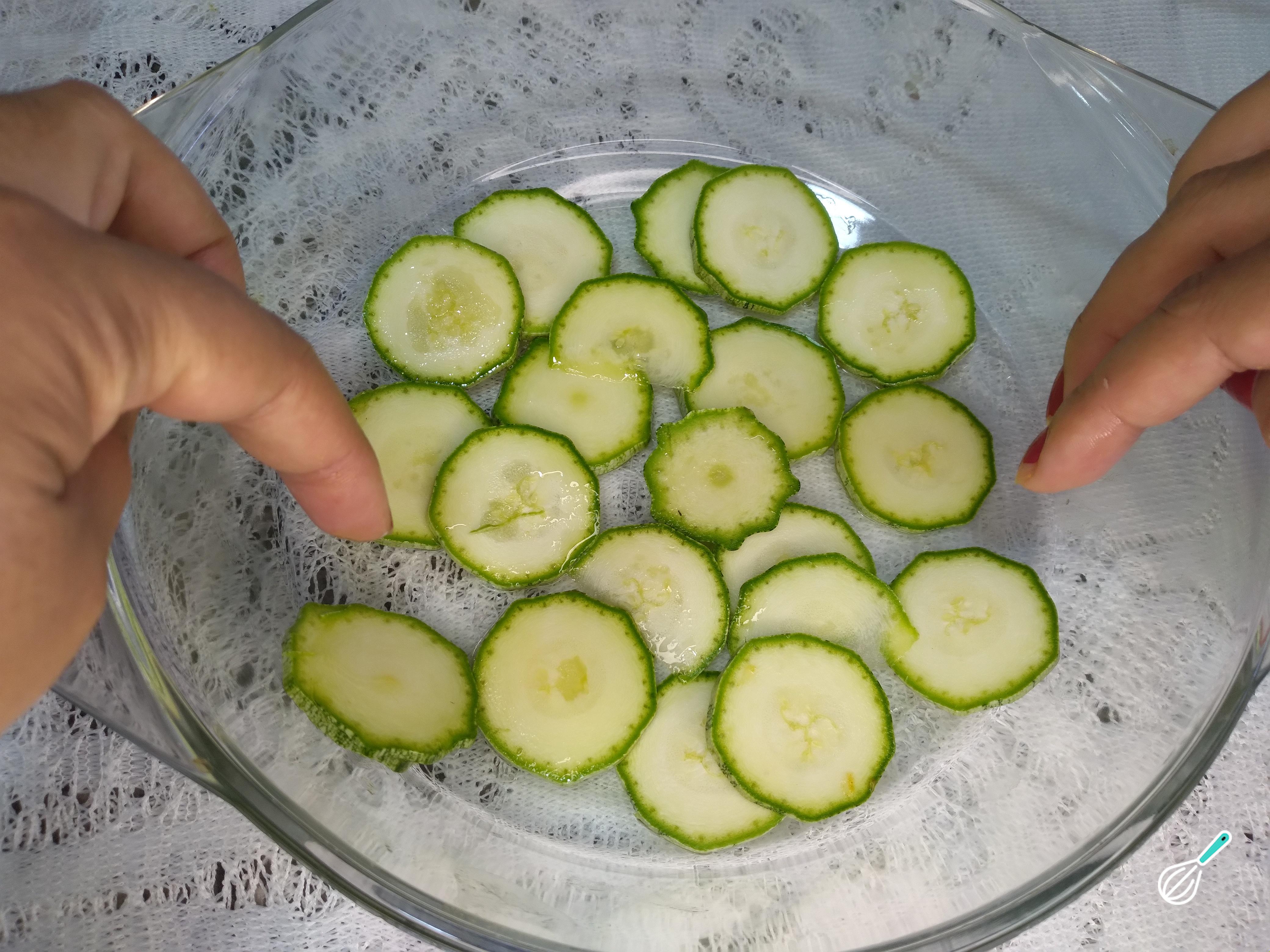 Feito isso, coloque as rodelas de abobrinha verde picadas no fundo do refratário. O ideal é colocar a abobrinha por baixo, pois ela solta líquido. Assim ajuda a assar o peixe e evita que o peixe agarre ao fundo.