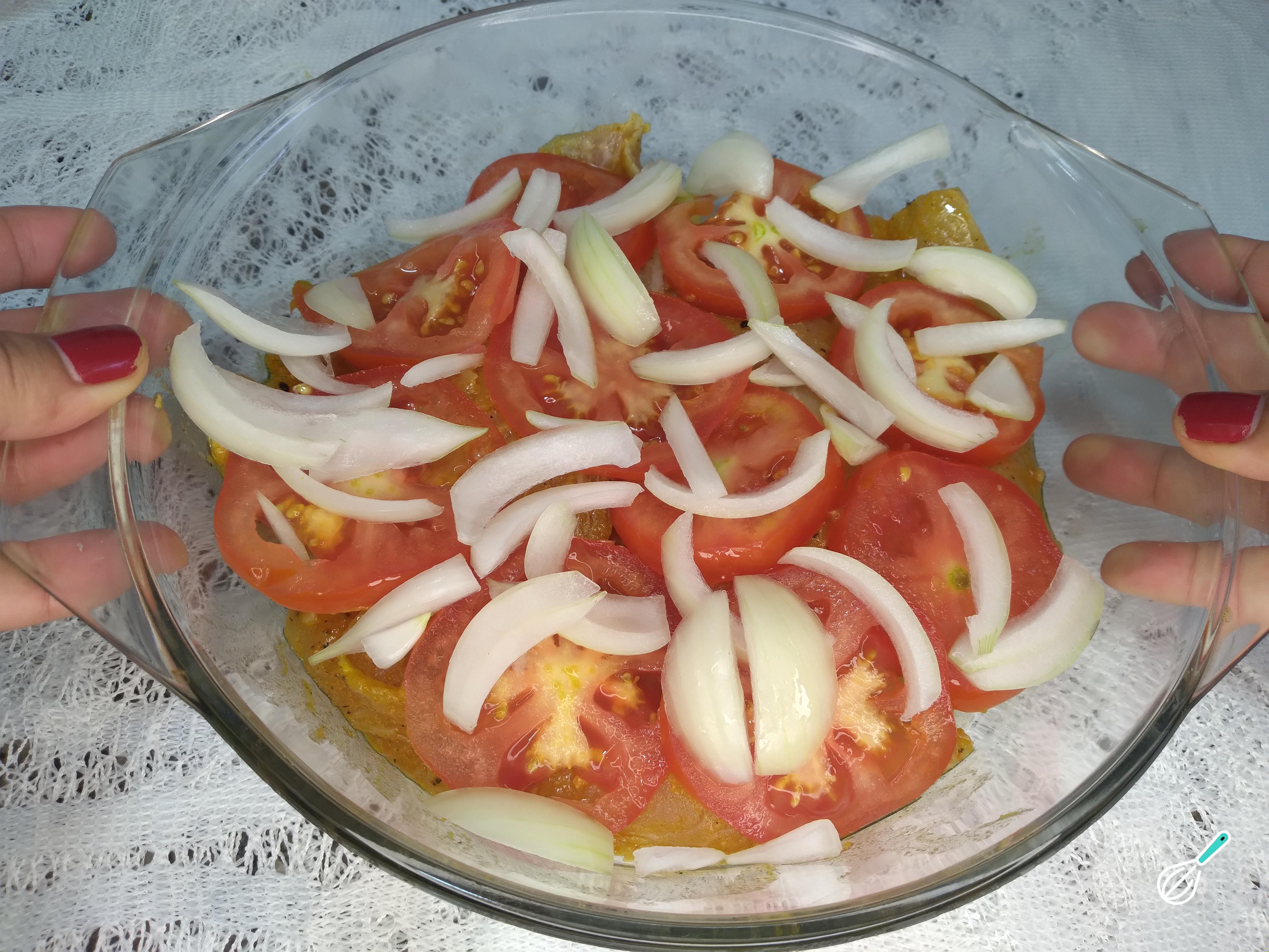 Depois disso, sobre a cama de legumes, coloque as postas de peixe e faça uma cama de rodelas de tomates. Os tomates também soltam líquido e ajudam no cozimento.