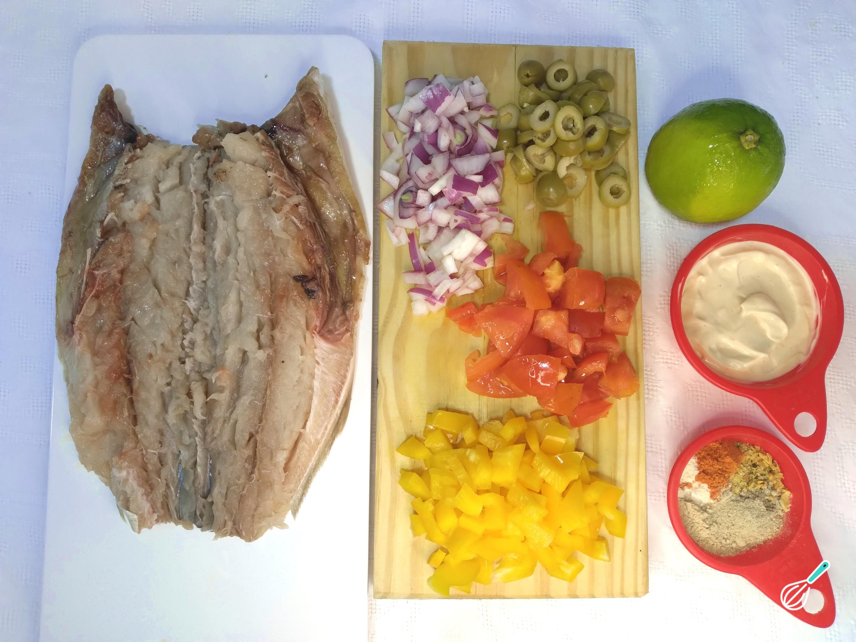 Comece separando os ingredientes. Escolha um peixe com poucos espinhos. Retire a cabeça e o rabo. Abra o peixe. É mais fácil já comprar o peixe limpo, mas se quiser limpe em casa. Corte a cebola roxa em cubos pequenos. Corte o pimentão também em cubos pequenos. Corte as azeitonas em rodelas finas e a cebolinha verde também em rodelas finas. Separe a maionese e os temperos de sua preferência.