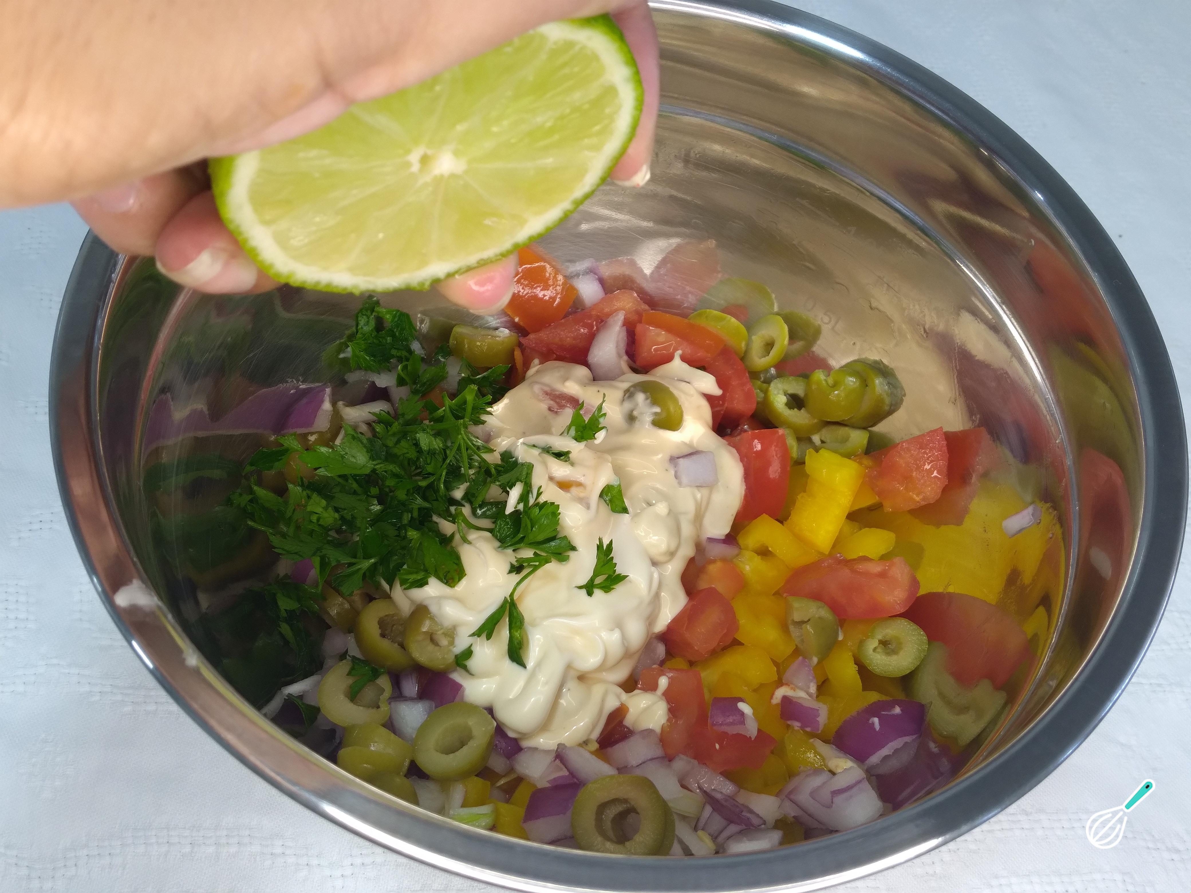 Enquanto o peixe assa no forno, coloque em um bowl, os legumes reservados, acrescente a metade da maionese que restou e a outra metade do limão. Esprema o sumo e misture bem.