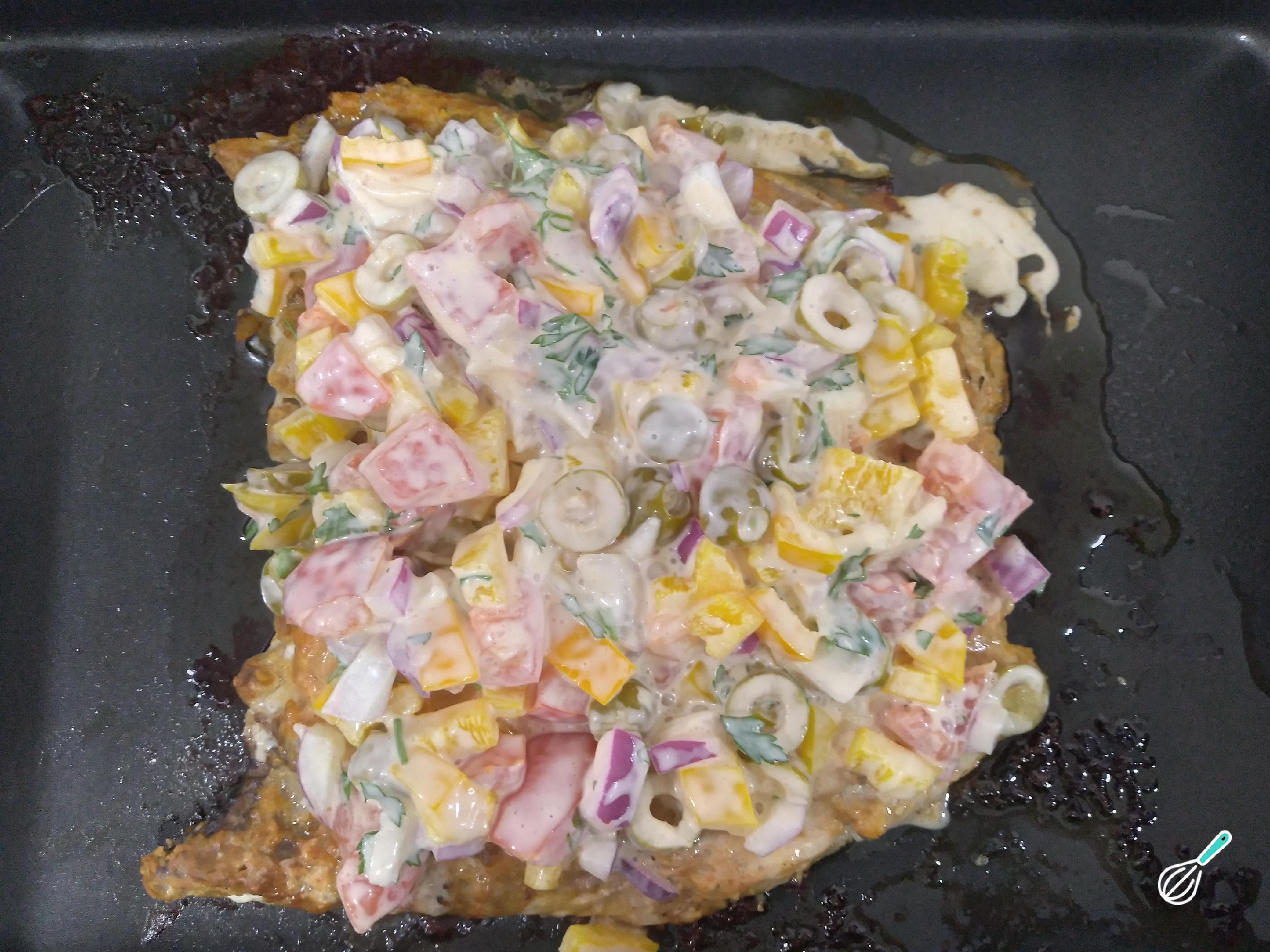 Depois dos 15 minutos, retire o peixe do forno e coloque o recheio de legumes e maionese. Leve ao fogo por mais 5 minutos para terminar de assar.