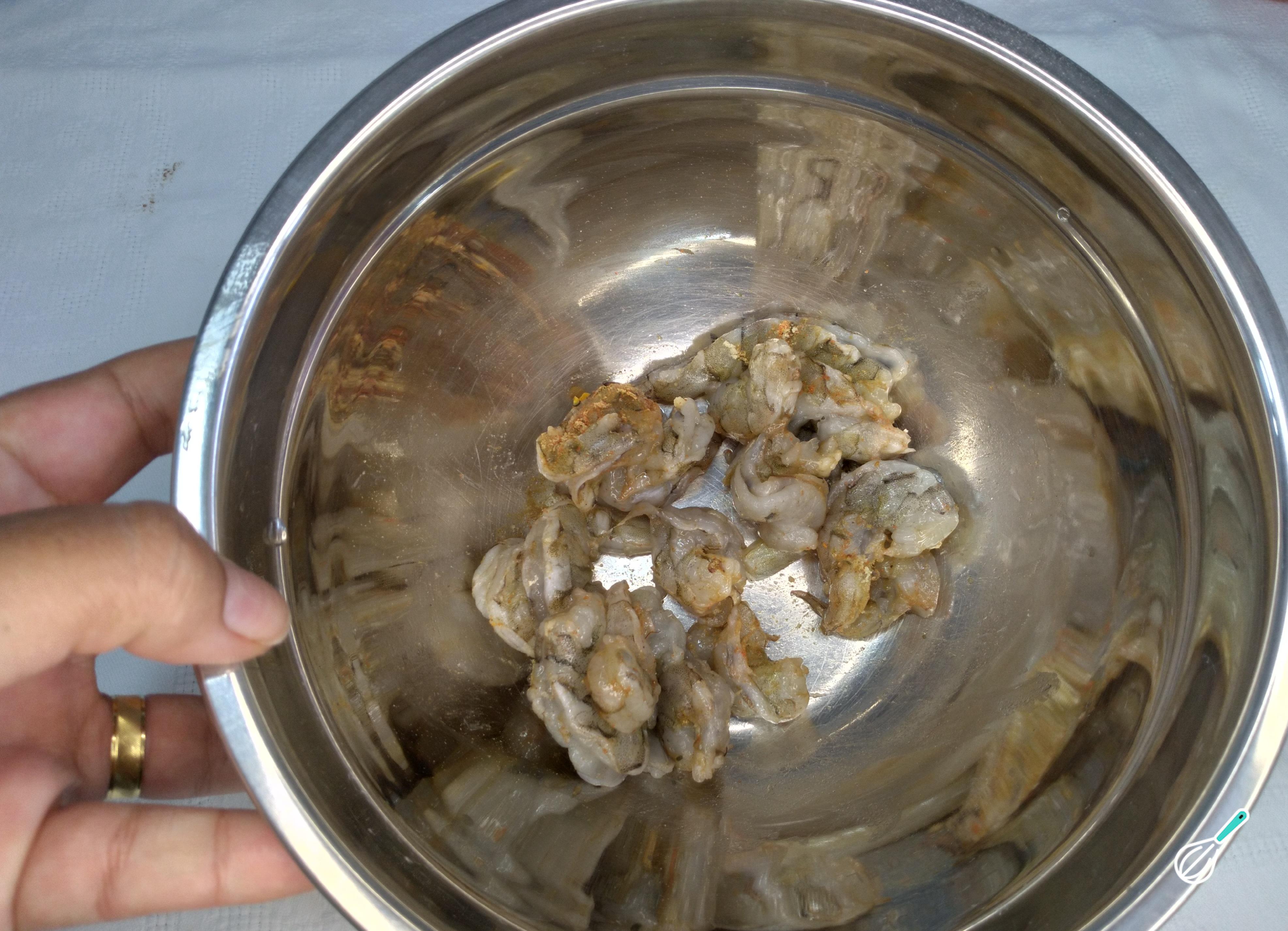 Tempere os camarões depois de limpar e lavar. Mexa bem para absorver os sabores. Use um pouco dos temperos reservados de sua preferência.