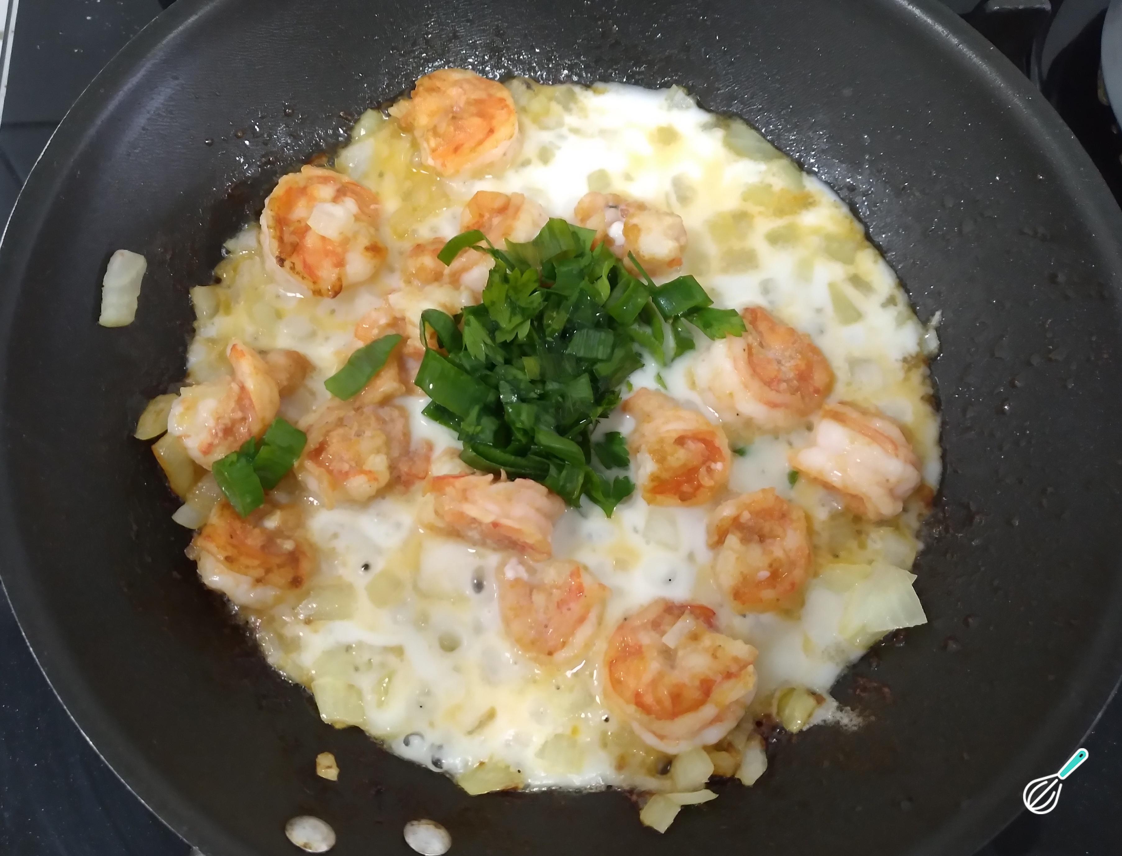 Feito isso, dissolva o amido de milho em um pouco de leite. Misture ao restante do leite e acrescente o leite e a cebolinha verde e a salsinha aos camarões. Mantenha o fogo baixo e mexa para não empelotar. Para mexer prefira usar uma colher de pau ou um fouet. Desligue o fogo e reserve o creme.