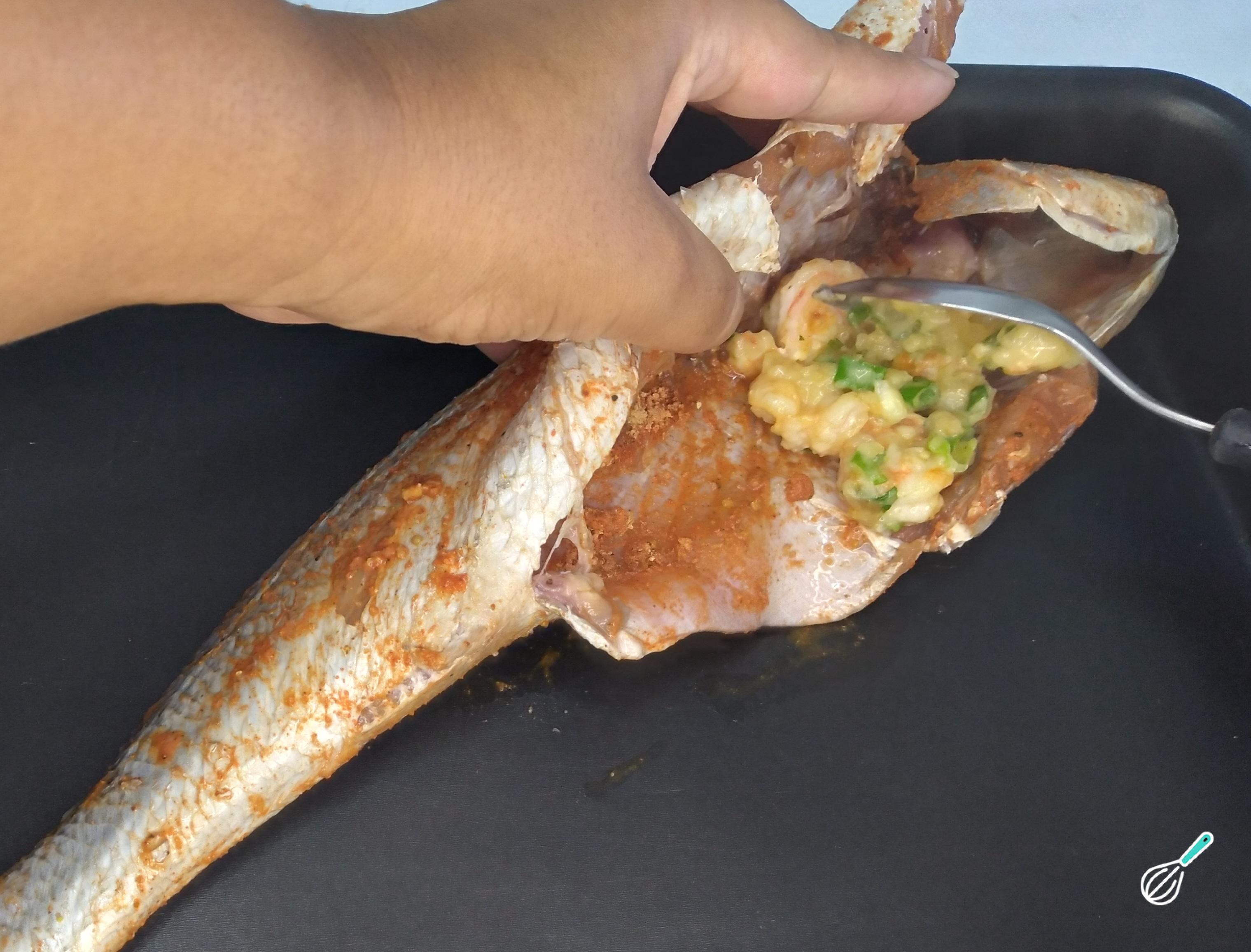 Prepare o peixe. Lave bem e tempere. Use os temperos de sua preferência. Em seguida, coloque o recheio de camarões dentro do peixe. Coloque com cuidado para que assim que assar não caia para fora o tempero.