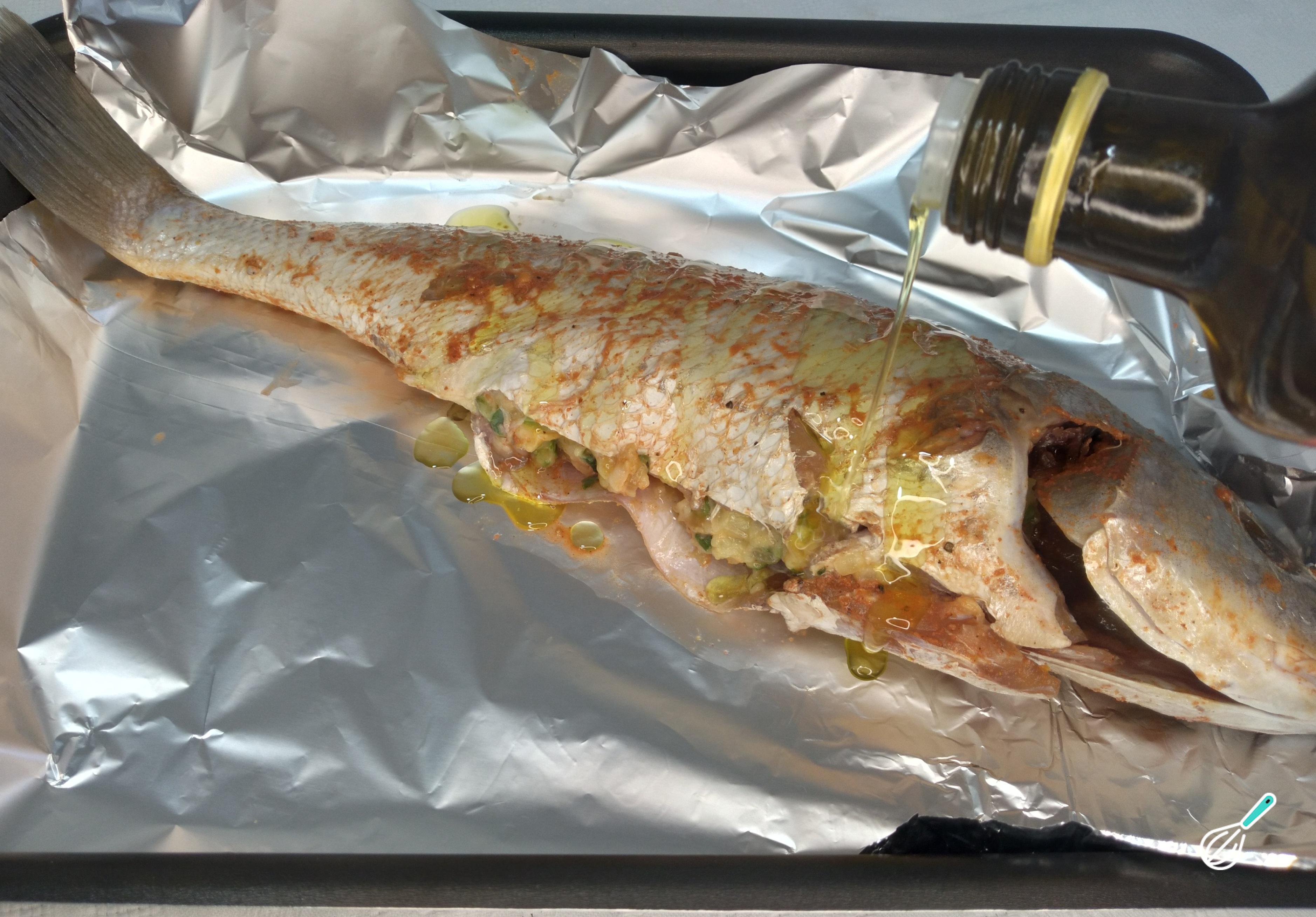 Abra o papel alumínio na assadeira e coloque o peixe sobre ele. Regue o peixe com azeite. Embrulhe o peixe com o papel alumínio. Esse procedimento vai garantir que o peixe fique bem assado e suculento por dentro evitando também que queime por fora.
