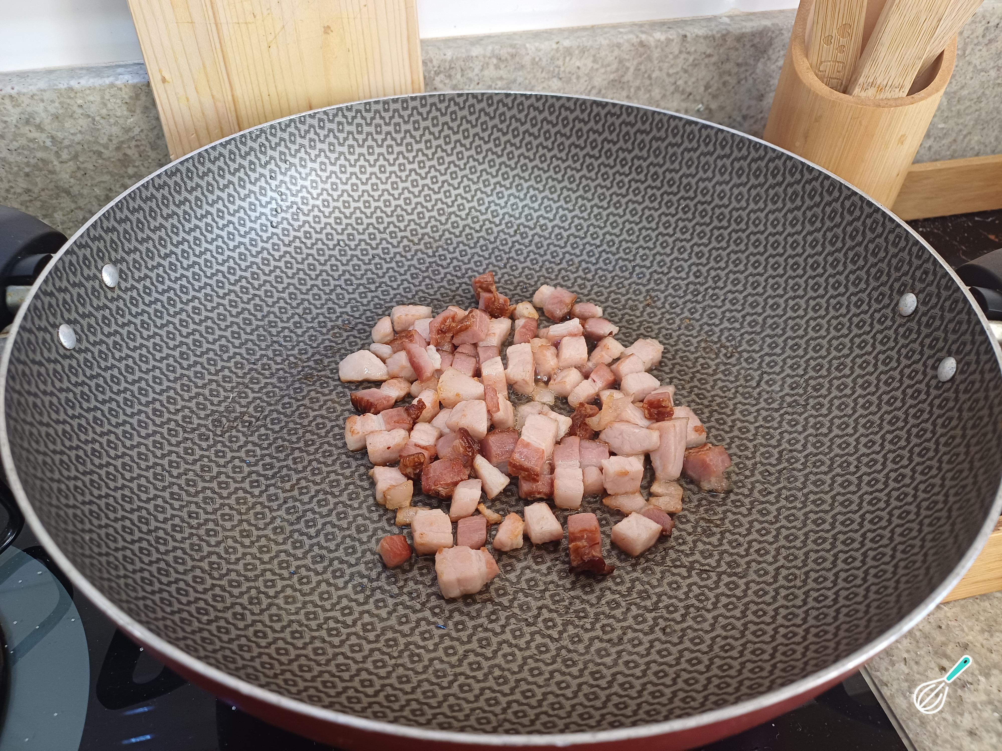 Prepare a farofa para rechear e servir como acompanhamento. Em uma panela frite bem o bacon, até dourar.