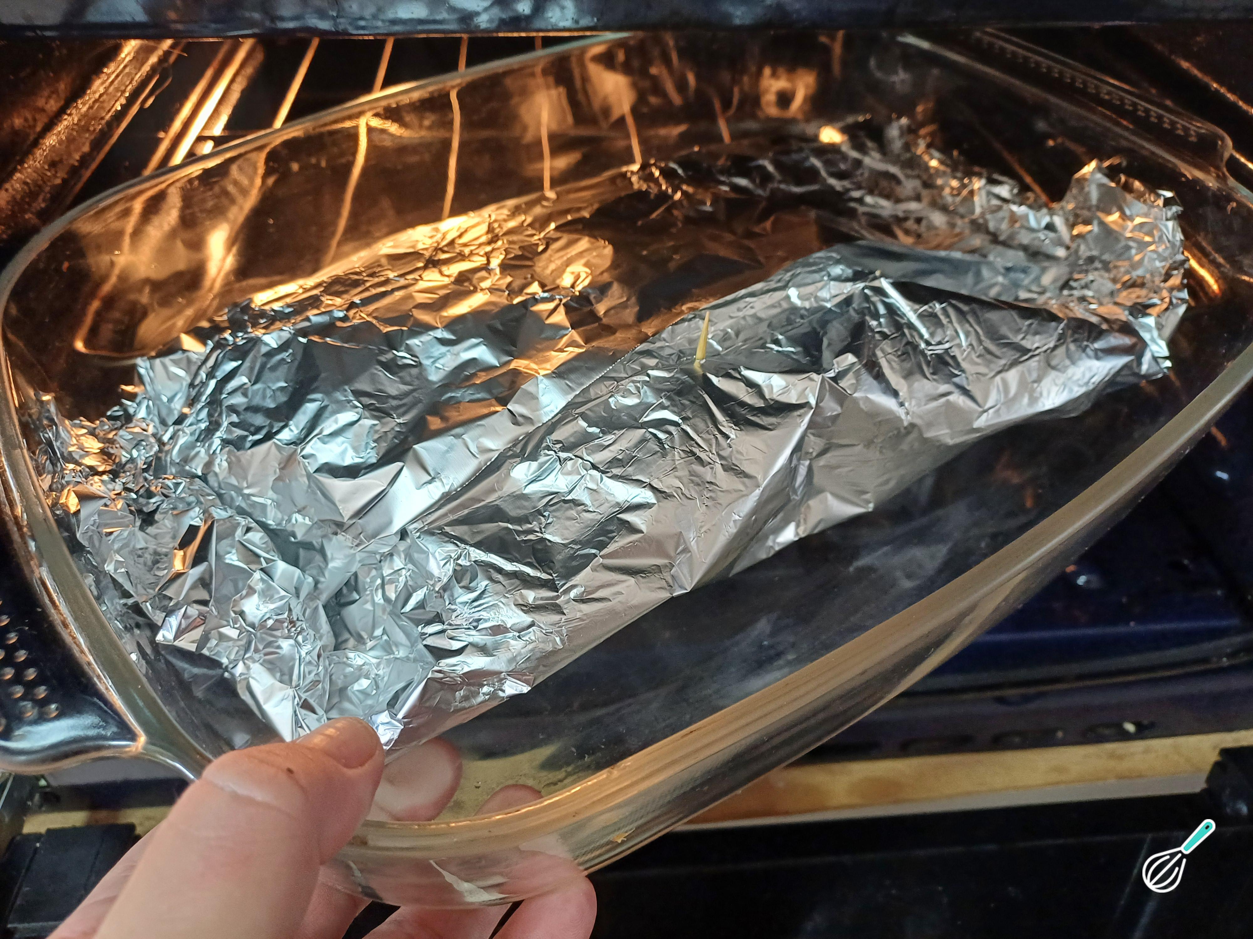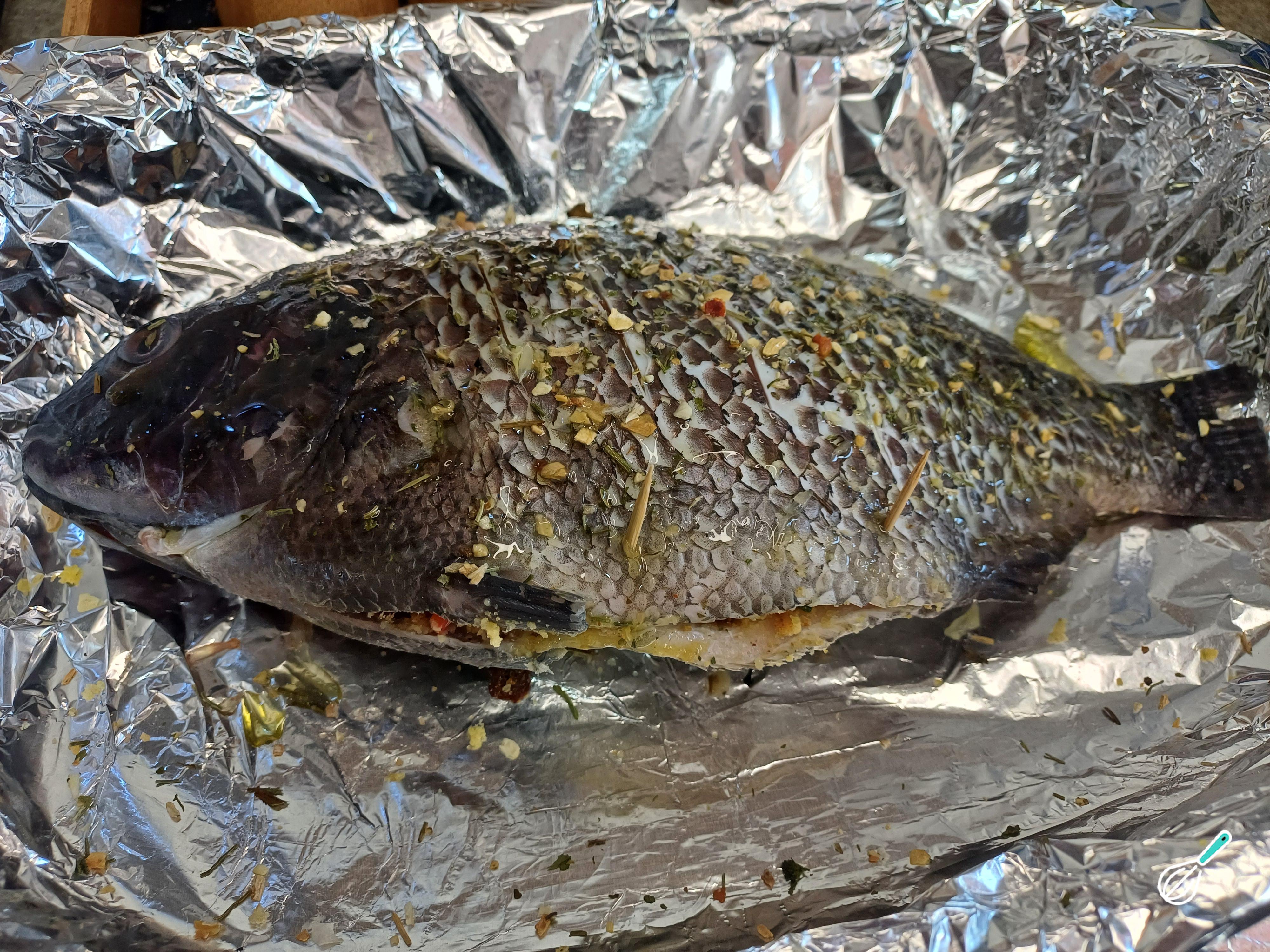 Cubra o peixe com o papel aluminio e leve ao forno pré-aquecido a 180º por 30 minutos.