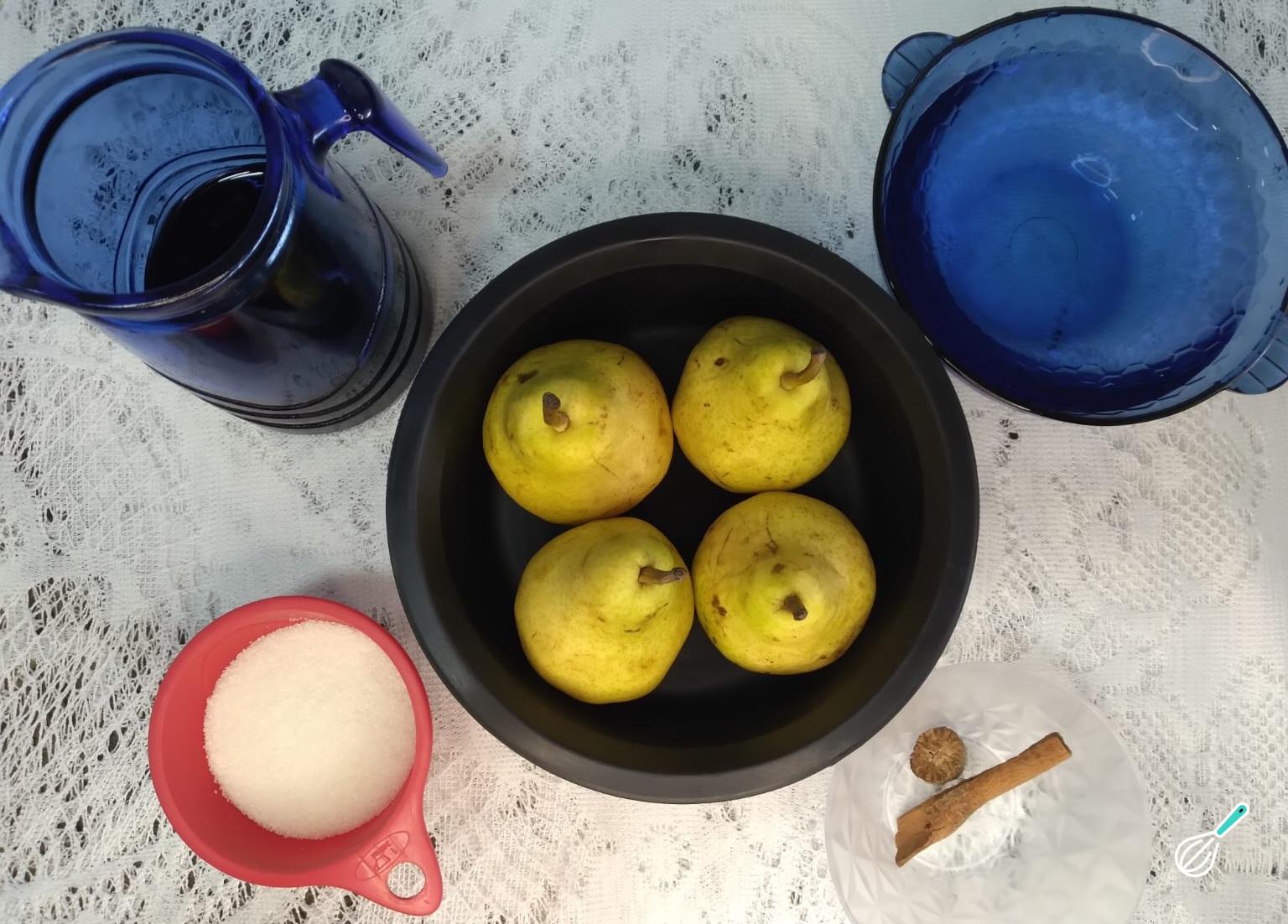 Comece separando os ingredientes que serão usados na receita de pera ao vinho. Separe as peras e lave bem. Separe o vinho tinto, a água, o açúcar, a canela e a noz moscada.