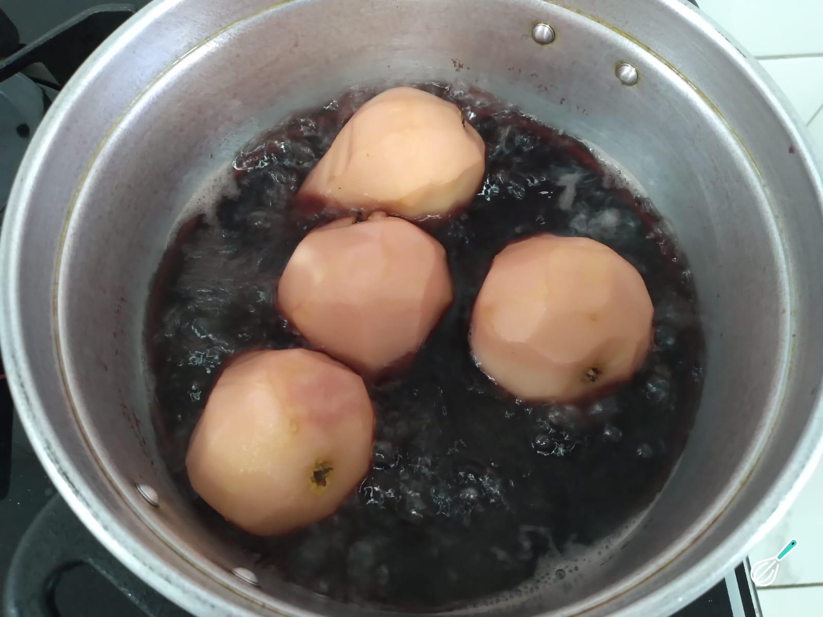 Deixe as peras cozinharem em de um lado e depois de cerca de 15 minutos vire, as peras para que cozinhem do outro lado. É importante que o cozimento esteja por igual dos dois lados. Também é importante que a calda esteja grossa e reduzida, para que assim tenha um resultado satisfatório da receita. Leva em média 30 minutos. Cozinhe cada lado das peras por 15 minutos.