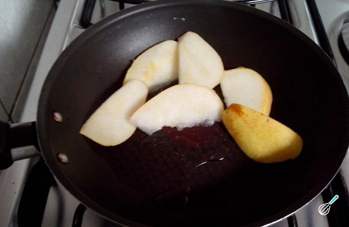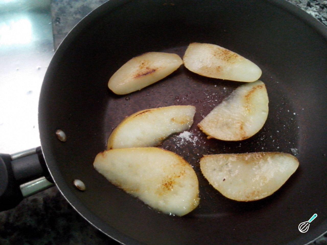 Para fazer esta receita de pera caramelizada fit em uma frigideira coloque derretendo o óleo de coco e adicione a pera cortada em fatias. Deixe dourar de um lado por 1 minuto em fogo alto.
