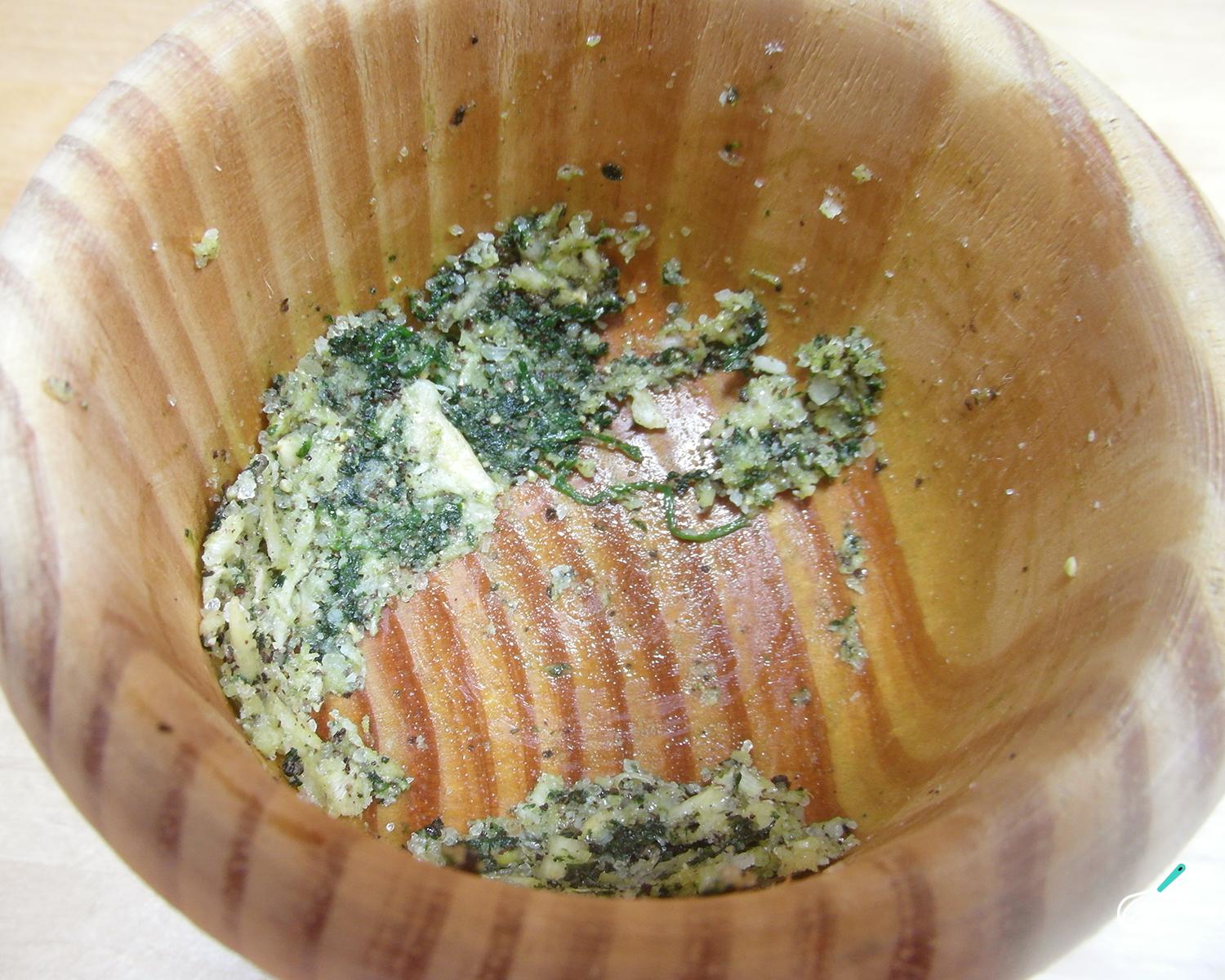 Comece preparando o tempero da perca: num almofariz esmague os alhos junto com a salsinha, a pimenta e o sal. Este é um truque para misturar bem todos estes ingredientes e ativar os seus sabores. Acrescente o azeite e misture.