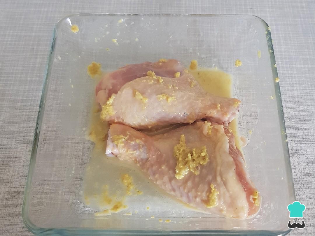 Antes de levar ao forno, preaquecido a cerca de 200°C, adicione o vinho e a margarina por cima das perninhas.