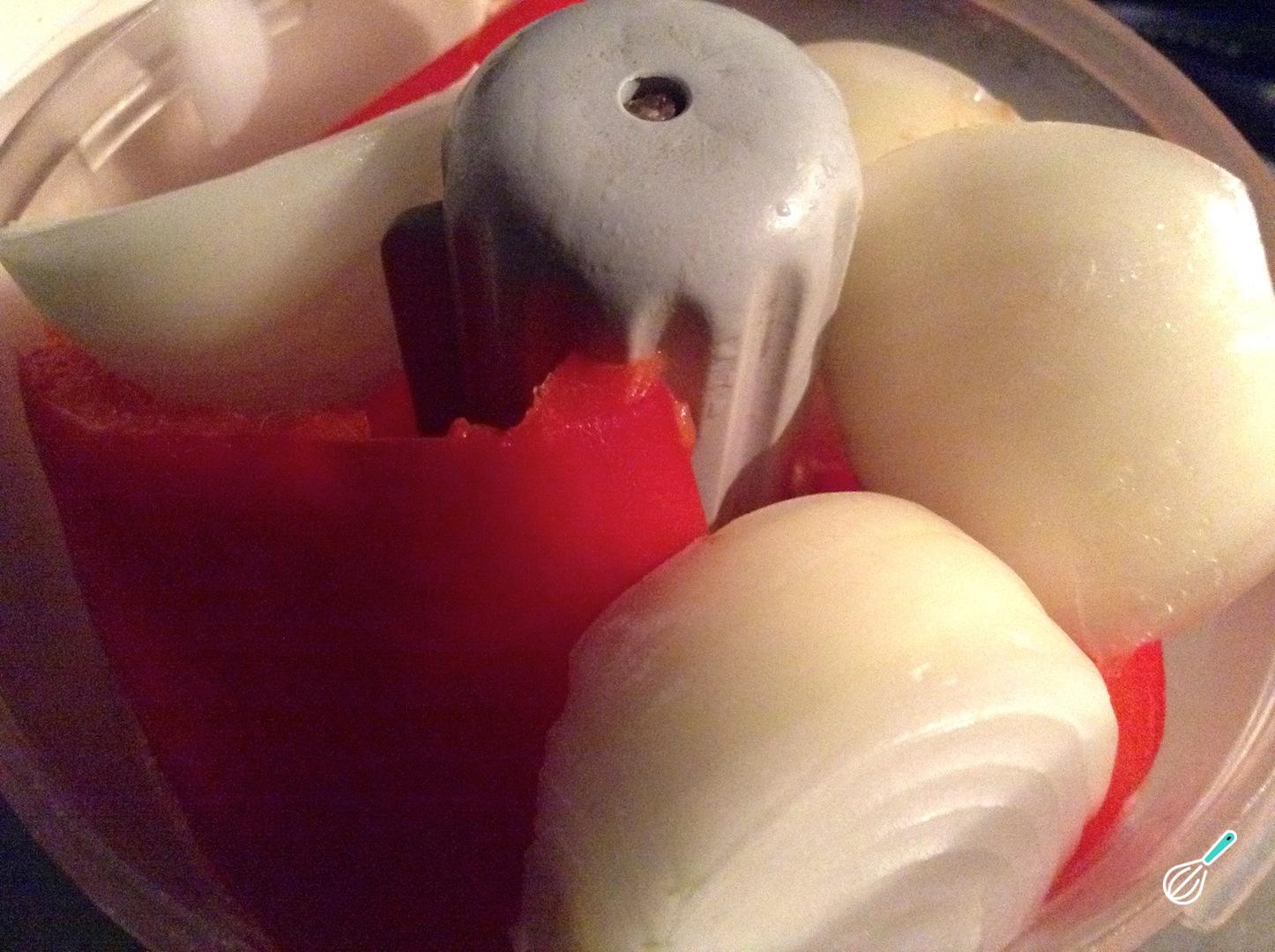 Em seguida prepare a marinada da carne: bata no liquidificador ou processador um dos pimentões sem as sementes, uma cebola, o alho-poró e a cerveja. Bata muito bem, para que esse molho fique o mais homogêneo possível.