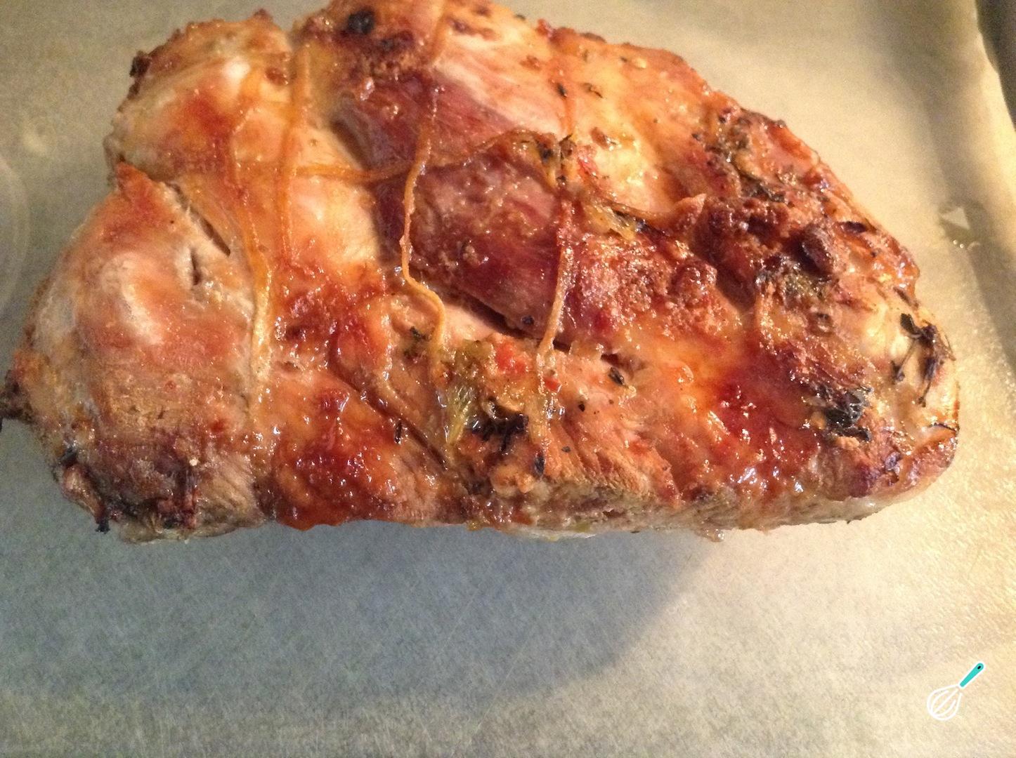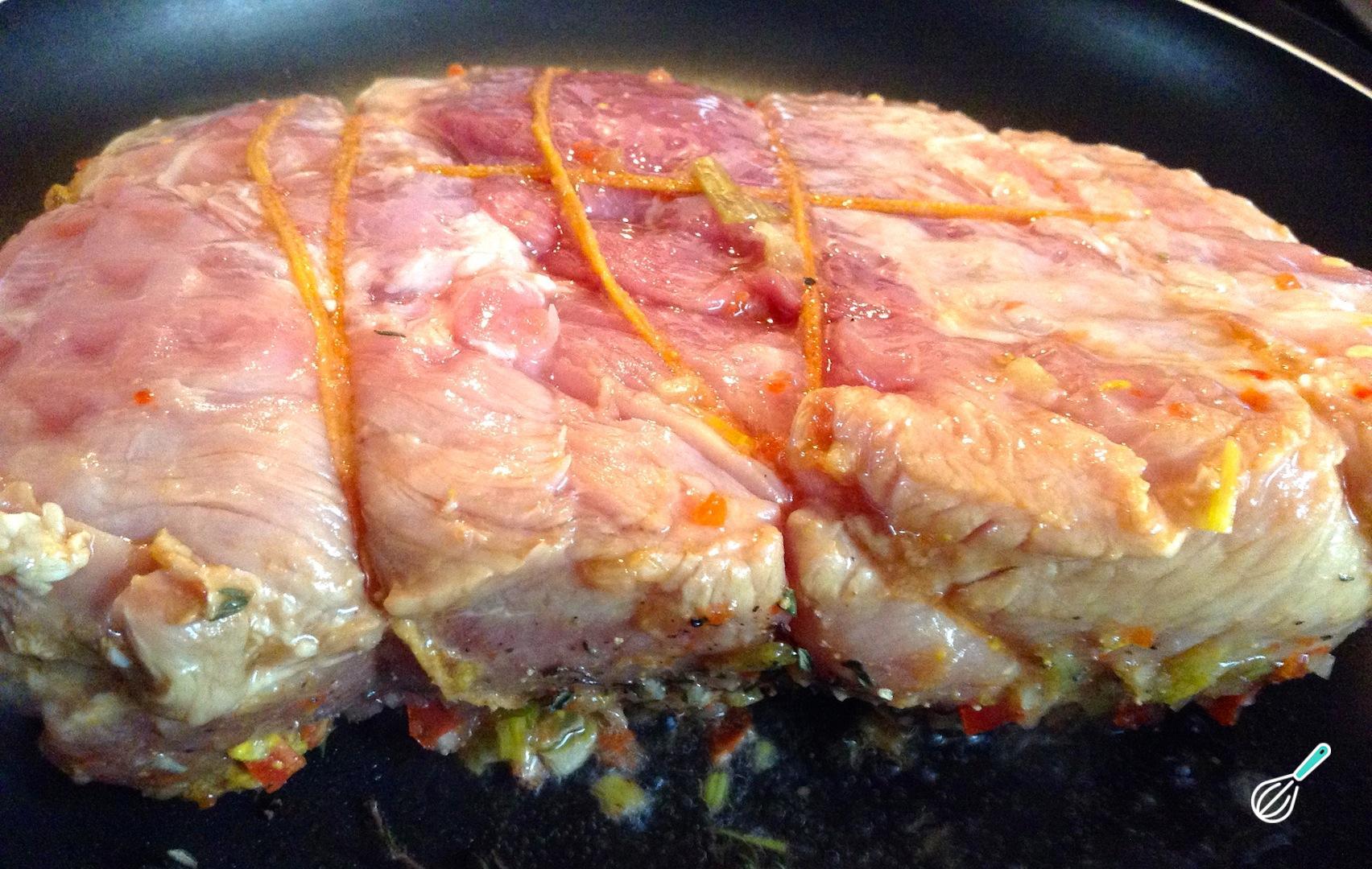 De seguida prepare a carne retirando o excesso de gordura. Se, tal como eu, estiver usando pernil sem osso, amare-o com fio barbante para que não perca a forma.