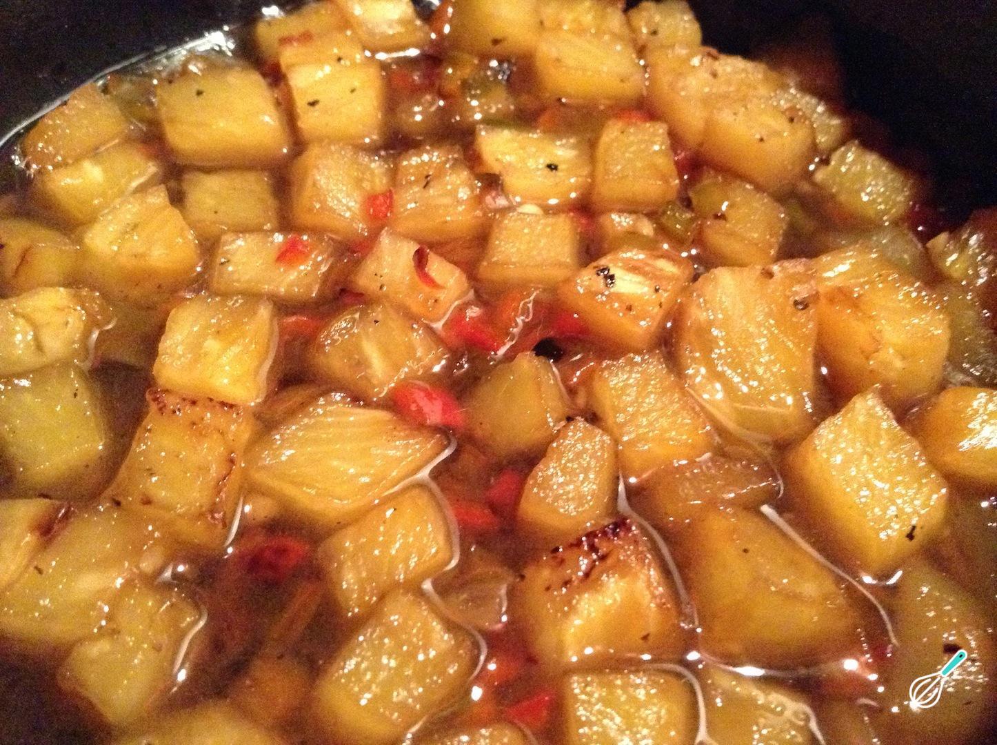 Cubra com água quente, adicione o gengibre e deixe ferver em fogo médio até que o molho reduza e fique com consistência de caramelo. Desligue o fogo e, se quiser, bata este molho agridoce de abacaxi, para ficar homogêneo, ou deixe assim mesmo.