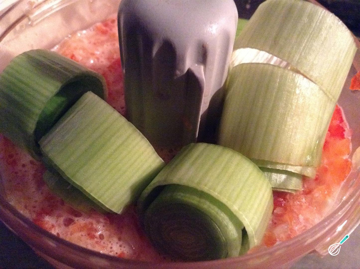 Prepare a marinada colocando no liquidificador ou processador de alimentos o pimentão sem sementes e a cebola, ambos cortados em pedaços. Acrescente uma lata de cerveja e bata tudo, até obter uma espécie de purê. Depois acrescente o alho-poró, também em pedaços, e volte a bater.