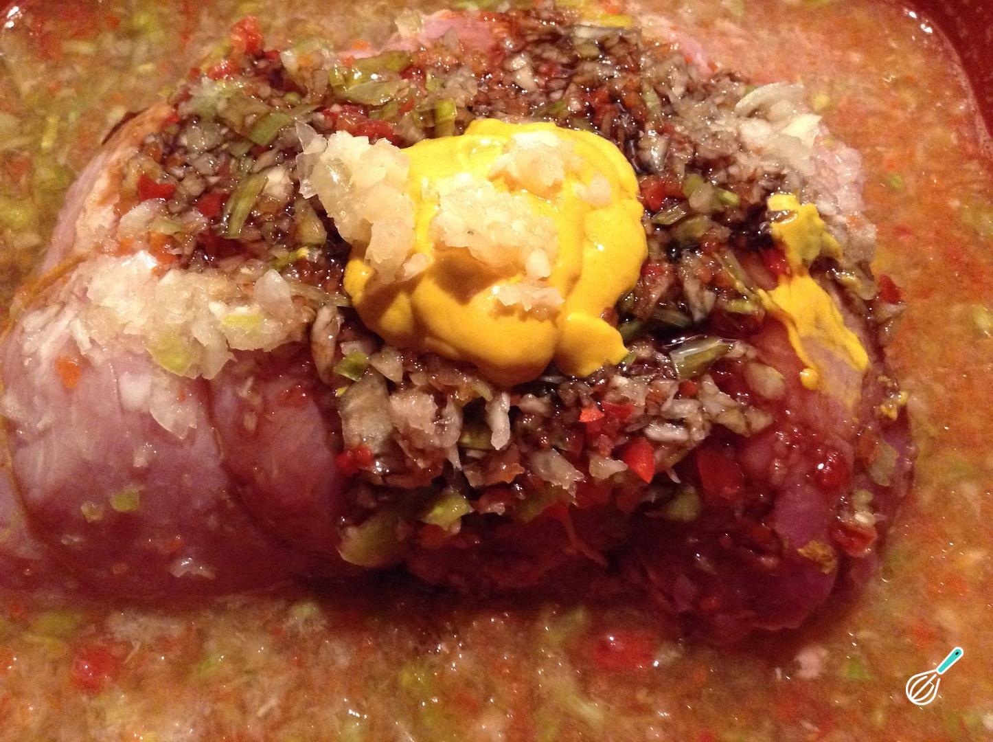 Coloque o pernil de porco num recipiente grande (de preferência com tampa) e verta sobre ele o preparado anterior e os restantes ingredientes da marinada: a pasta de alho, as cervejas, a mostarda e o molho escuro. Misture tudo.