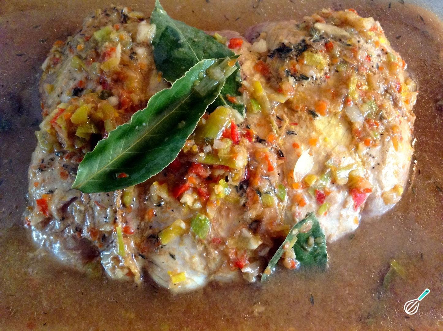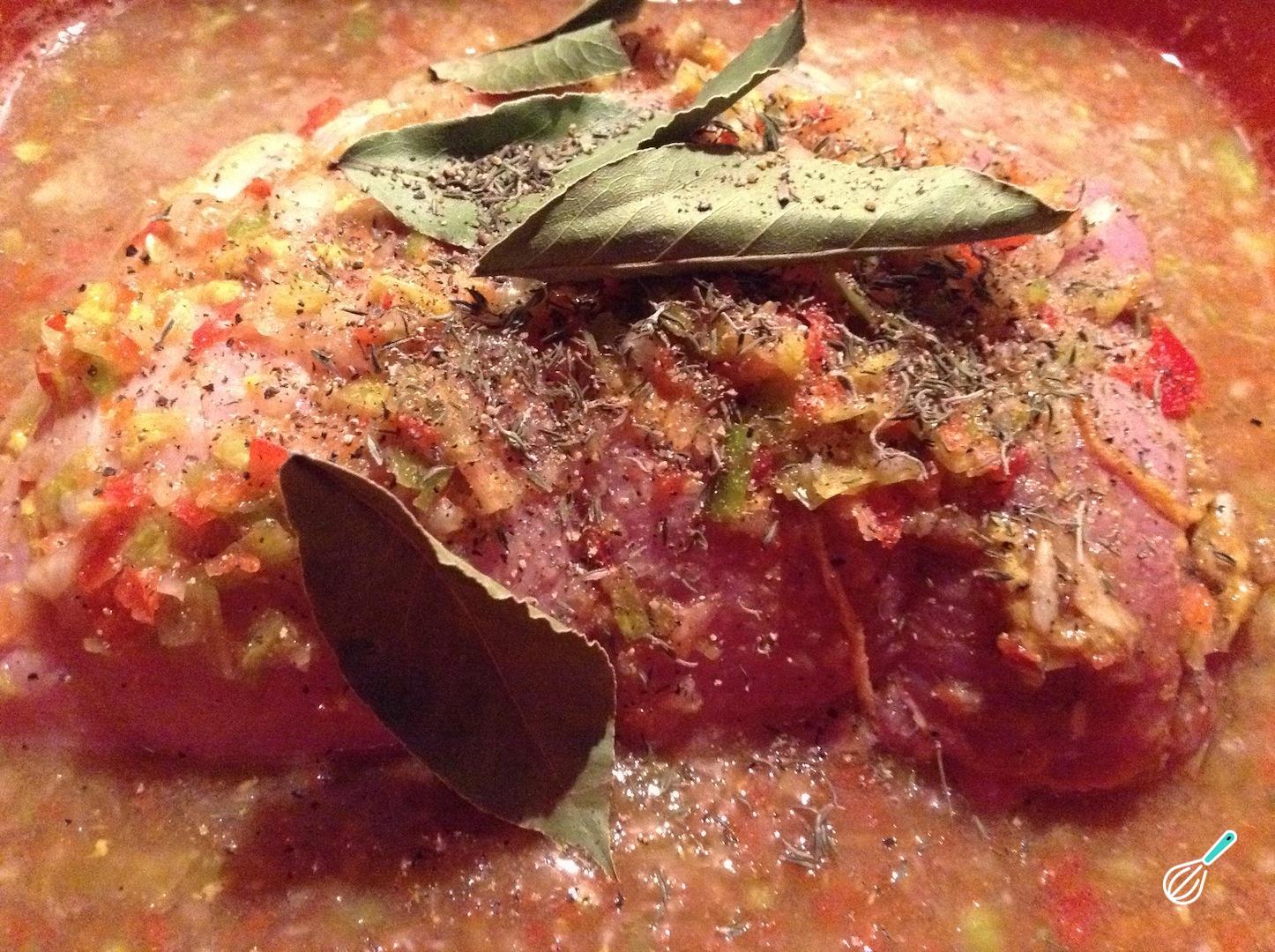 Termine com as folhas de louro, o tomilho e a pimenta do reino, volte a misturar e tampe. Deixe marinando na geladeira por 24 a 48 horas, para que o sabor do pernil de porco fique bem apurado!